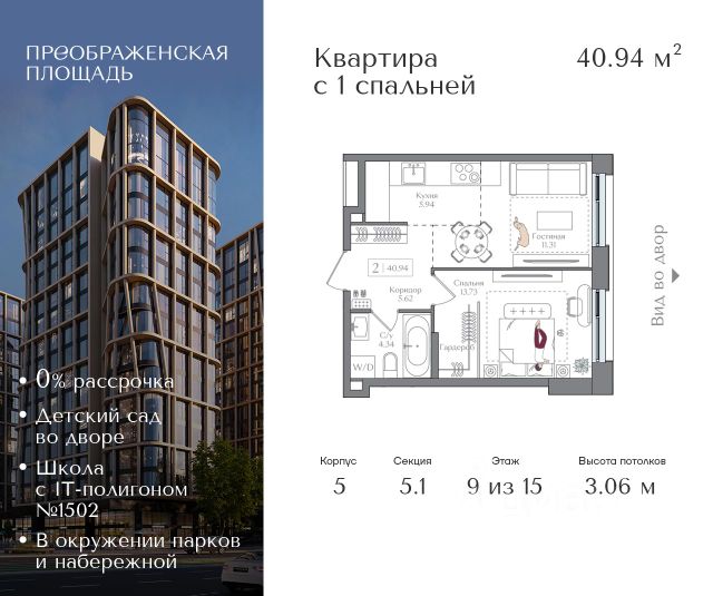 Квартира расположена в секции 5, окна выходят во внутренний двор.