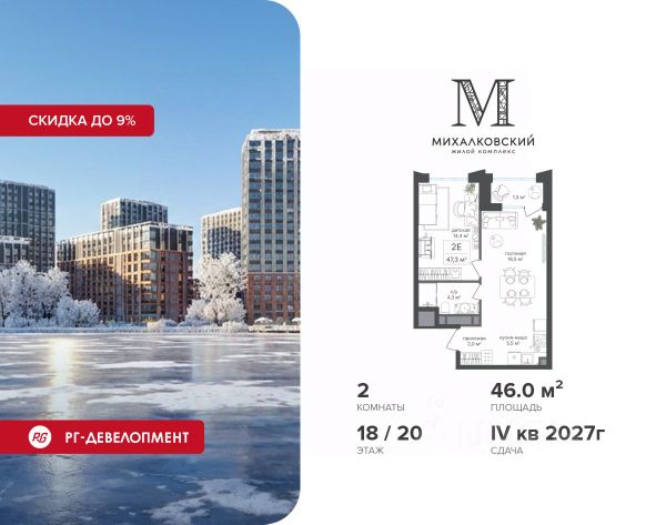 Скидка 9% при покупке квартиры! Продаётся 2-к квартира 42,2 кв.м. в ЖК "Михалковский" на 2-м этаже 20 этажного дома. Ипотека для каждого! Полная стоимость кредита от 13,192% до 17,149%. Ставка от 0,11% в АО "Альфа-Банк", ген. лицензия ЦБ РФ 1326 от 16.01.2015. Ставка фиксируется на первые 12 месяцев, далее полная стоимость кредита от 22,022% до 24,599% ставка 21,59%. Первоначальный взнос — от 20,1% от стоимости квартиры. Срок кредитования — от 4 до 30 лет. Компания "РГ-Девелопмент" предоставляет скидку на квартиры в жилом комплексе. Акция действительна до 15.03.2026 включительно. Для того чтобы воспользоваться предложением, необходимо подписать договор на приобретение недвижимости до 15.03.2026 включительно. Действует программа "Растет семья - растет и квартира". Компания "РГ-Девелопмент" вошла в ТОП-10 девелоперов по объёму введённого жилья в "Старой Москве" по итогам 2025 года. Прямая продажа от застройщика! Квартиры без отделки. Срок сдачи IV кв. 2027г. Особенности проекта: Завораживающие виды Красивое благоустройство Уникальная локация для Москвы (рядом Головинский парк, пруды, усадьба Михалково) Рядом с центром В проекте присутствует: архитектура голландского бюро MLA+, зеленые зоны, транспортная доступность, благоустроенная территория, подземный паркинг, детский сад и выход на Головинский парк с пятью прудами. Название комплекса указывает на одну из его черт - соседство с имением Михалково. Позвольте себе жить в месте, где проводили свой досуг династии Дашковых и Паниных.