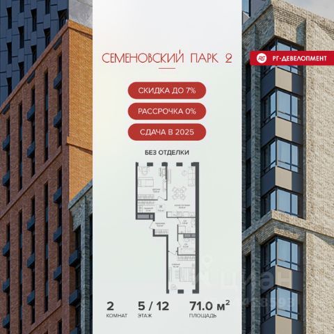 Ипотека для каждого! Полная стоимость кредита от 11,578% до 22,490%. Ставка от 0,11% в АО "Альфа-Банк" фиксируется на 1 год с даты заключения кредитного договора, далее полная стоимость кредита от 25,819% до 28,767% ставка 21,59% до окончания срока кредитования. Первоначальный взнос — от 20% от стоимости квартиры. Срок кредитования — от 3 до 30 лет. Ипотека на весь срок! Полная стоимость кредита от 23,396% до 26,058% со ставкой 14,5%! Первоначальный взнос —от 20,01% от стоимости квартиры. Срок кредитования — от 3 до 30 лет. АО "Банк ДОМ.РФ" универсальная лицензия Банка России 2312 от 19.12.2018. Скидка 7% при покупке квартиры! Цена указана с учетом максимального размера скидки. Продается 2-к квартира 62,2 кв.м. в ЖК "Семеновский парк 2" на 11-м этаже 25 этажного дома. Компания "РГ-Девелопмент" предоставляет скидки на квартиры в жилом комплексе. Акция действительна с 12.09.24 г. до 30.11.25г. включительно. Чтобы воспользоваться предложением, необходимо подписать договор на приобретение недвижимости до 30.11.25г., включительно. Скидка 5% + Рассрочка 0% При приобретении дольщиком квартиры с использованием способа оплаты "Рассрочка 0%", у покупателя также есть право воспользоваться скидкой в размере 5% от полной стоимости квартиры. Условия программы рассрочки: - Первый платеж составляет 20% от стоимости объекта и вносится при заключении ДДУ. - Оставшаяся сумма выплачивается за месяц до планового срока ввода ЖК в эксплуатацию, то есть не позднее 30.11.2025. Прямая продажа от застройщика! Квартиры без отделки. Срок сдачи корпуса - 4 кв. 2025 г. ЖК "Семеновский парк 2" - это идеальное место для того, чтобы стать вашим домом. Проект расположен в исторической части Москвы вблизи Измайловского лесопарка, в 1 км от ЦАО. 4 станции метро отделяют вас от Красной площади и 15 минут на автомобиле - от Садового кольца.