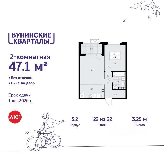 Продается двухкомнатная квартира 157 в новостройке ЖК "Бунинские кварталы" по адресу Москва, ТиНАО, Новомосковский АО, Сосенское С/П, жилой комплекс Бунинские Кварталы, 9.1, район Коммунарка, Новомосковский административный округ, Москва. Общая площадь квартиры - 47.10 кв. м., этаж 17 из 17, секция 2. Тип проекта, по которому построен дом - монолит, компания-застройщик - ООО "А101". Стоимость квартиры - 17507541 Р. Срок сдачи - 1 квартал 2026. ПРЕДЛОЖЕНИЯ ОТ ЗАСТРОЙЩИКА В ФЕВРАЛЕ 2026: Скидки до 10% на все квартиры. Только в офисах продаж до 28 февраля. Ипотека от 13,9 % для всех! На весь срок. "Семейная ипотека" вернулась. Ставка от 3,5 % на весь срок! Без удорожания! Выгодное ипотечное комбо: Ипотека от 2200 р./мес. и от 6 % после рождения ребёнка! Ипотека для всех "Держи пять!" - ставка 5 % на 2 года! *более подробную информацию по скидкам и акциям уточняйте в отделе продаж ЖК "Бунинские кварталы" строится на юго-западе Москвы. Монолитные дома в лаконичной стилистике гармонируют с живописной природой. Из любой точки района удобно добираться до природных объектов, ключевых транспортных узлов, крупных торговых, спортивных, деловых и медицинских центров. Концепция уникального благоустройства района - "Выходи гулять!". Здесь появятся эстрада для районных творческих мероприятий, спортивные и игровые площадки, скейт-парк, дружелюбные пространства для домашних питомцев, благоустроенная набережная Ивановского пруда. В районе формируется собственная развитая инфраструктура: современные школа на 1100 мест и 2 детских сада на 540 малышей, магазины у дома и сетевые супермаркеты, фитнес, кафе, салоны, детские развивающие центры. Крытый каток "Самолёт Арена" - в 10 минутах пешком. За 15 минут можно дойти до действующей станции метро "Потапово". Предусмотрены удобные автомобильные выезды на проспект Куприна и улицу Александры Монаховой. Особенности "Бунинских кварталов": - ст. метро "Потапово" - 15 минут пешком - своя школа и детские сады - безопасные дворы без машин с системой контроля доступа - насыщенная инфраструктура - в шаговой доступности и на первых этажах домов