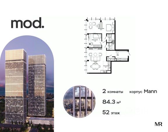 Прямая продажа от застройщика. Продается 2-комнатная квартира общей площадью 68.60 м² без отделки в ЖК премиум-класса Mod на 52-м этаже 55 этажного дома. Mod - жилой комплекс премиум-класса в историческом районе Москвы Марьина Роща, состоящий из трех клубных домов (9 этажей) и трёх разноэтажных башен (44-55 этажей). Закрытая территория жилого комплекса, продуманное благоустройство, эксплуатируемые кровли стилобата, образовательный центр с детским садом создают приватное пространство для тихой семейной жизни, а городская площадь с фонтанами, ресторан, супермаркет, коммерческая инфраструктура на первых этажах привносят созвучную с ритмом города динамику. Преимущества проекта: - В шаговой доступности новый деловой кластер Москвы - Выразительная авторская архитектура - Единственные в Москве фасады башен из натурального камня - Панорамное остекление и высота потолков до 4,8 м - Квартиры и апартаменты с отделкой MR Base - Многоуровневое благоустройство с зонированием на закрытой территории - Многофункциональный образовательный детский центр с детским садом - Двухуровневый подземный паркинг Транспортная доступность: - 5 минут пешком до станции метро "Марьина Роща" - 3 минуты до ТТК - 15 минут до Цветного бульвара Компания MR предлагает своим клиентам специальные условия приобретения квартир в рамках программ ипотечного кредитования от банков-партнеров.
