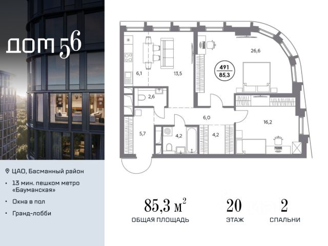 В премиум-квартале "Дом 56" на Бауманской напрямую от девелопера ГК "Галс-Девелопмент" представлена 2-комнатная квартира на 3 этаже общей площадью 74.00 м². Квартира предлагается без отделки, со свободной планировкой. Пространство позволяет воплотить дизайн - проект в соответствии с Вашими предпочтениями. "Дом 56" - расположен в Басманном районе на ул. Фридриха Энгельса, всего в 12-15 минутах пешком от станций метро "Бауманская" и "Электрозаводская". Рядом с премиум-кварталом находятся важные городские магистрали - ТТК, набережная реки Яузы и Бакунинская улица, переходящая в Спартаковскую и Маросейку. Архитектурный стиль "Дома 56" - параметрический минимализм. Футуристические фасады квартала с "эффектом закручивания" словно вращаются вокруг своей оси. Динамичный образ башен дополняет эффектное остекление - окна в пол будут в каждой квартире. "Дом 56" станет органичным продолжением современной научно-креативной среды Басманного района: - Развитое окружение - десятки различных точек притяжения; - Близость престижных вузов: МГТУ, МЭИ и Британская высшая школа дизайна; - Соседство с Технологической долиной и всем необходимым для запуска стартапа; - Набережные и парки для спорта и отдыха. "Дом 56" оснащён первоклассными инженерными системами. Входы на территорию, в здание и паркинг оборудованы системой контроля и управления доступом. С любого этажа в лобби и паркинг спускаются быстрые и бесшумные лифты премиального бренда. Во внутреннем приватном дворе будет создано пространство в бионическом стиле с лаунж-зонами, подвесными качелями, детскими плейхабами для разных возрастов, площадками для спорта и отдыха в окружении зелени. На двух подземных уровнях предусмотрен подземный паркинг и кладовые помещения.