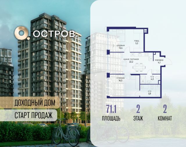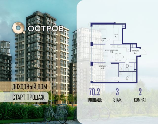 Продаётся 2-комн. квартира от застройщика: общая площадь 70.20 м², жилая 29.40 м², кухня 22.20 м², 3-й этаж, жилой квартал "Остров 14", корпус 6 (секция 1). Срок сдачи: 2 квартал 2029 года. 2 совмещенных санузла. Остров.14 ДОХОДНЫЙ ДОМ - ЧАСТЬ ПРОЕКТА "ОСТРОВ", В 10 МИНУТАХ ОТ МОСКВА-СИТИ, В 15 МИНУТАХ ЕЗДЫ ОТ САДОВОГО КОЛЬЦА. Квартиры для сдачи в аренду Инвестиционный продукт для получения постоянного дохода Квартиры с отделкой и мебелью, и с управлением "под ключ" Постоянный доход для инвесторов, отельный сервис для арендаторов Востребованные для аренды планировки: студии, 1- и 2-комнатные квартиры 28-64 м2 Полная комплектация квартир: отделка, мебель, бытовая техника, кондиционеры Постоянный поток арендаторов - 10 минут от Москва-Сити, 5 минут от метро "Мневники", самодостаточная инфраструктура в квартале и собственная клубная инфраструктура в доме, спортивный, рекреационный и деловой кластеры на территории ОСТРОВА