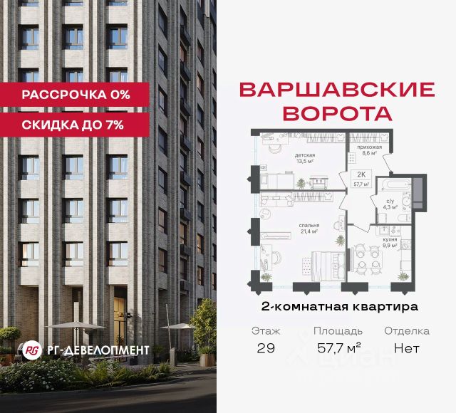 Рассрочка 0% + скидка 5%. Первый платёж 50% при ДДУ, второй 50% — через 12 мес. до ввода ЖК. Продаётся 2-комнатная квартира 60,0 кв.м. в МФК "Варшавские ворота" на 7-м этаже 30 этажного дома. МФК "Варшавские ворота" — это точка баланса между природой и городом, стилем и функциональностью, жизнью сегодня и устойчивым будущим. Коротко о важном: - 1 минута пешком от м. Аннино; - Удобные выезды на Варшавское шоссе и МКАД; - Вид из окон на Битцевский лес и Аннинский лесопарк; - Высота потолков 2,7 - 3 м; - Закрытый двор-парк; - Школы и детские сады в 10-15 минутах пешком от дома; - Технические лоджии для размещения кондиционеров; - Подземный паркинг; - РГ-Девелопмент — ТОП-20 крупнейших застройщиков Москвы. Проект сочетает в себе современную архитектуру и продуманное благоустройство с уникальным природным окружением. Всего в нескольких минутах от дома — девять парков, каскад прудов и крупнейшие лесопарковые зоны Москвы, создающие ощущение жизни в зеленом оазисе посреди мегаполиса. Архитектурная концепция - стиль Чикаго в Москве. Фасады облицованы вентфасадами под клинкерную плитку. Металлические вставки придают динамику, подчёркивая современный характер комплекса. Фасады подчеркивают строгие линии и современный стиль, а входные группы разработаны московским бюро Syntaxis. Лобби оформлены с применением керамогранита, декоративной штукатурки и гипсовых панелей, детали из латуни добавляют изысканности. Проект находится в одной минуте пешком от метро "Аннино", в 12 минутах от станции "Улица Академика Янгеля" и рядом с МЦД-2 "Красный Строитель". Для автомобилистов предусмотрен прямой выезд на Варшавское шоссе и два съезда на МКАД, что позволяет быстро добираться в любую часть города. Среди планировочных решений представлены разнообразные форматы: от функциональных студий до просторных 4-комнатных квартир и апартаментов площадью от 22 до 105 м². Высокие потолки усиливают ощущение простора, а продуманные планировки включают мастер-спальни, гардеробные, угловые окна, объединённые кухни-гостиные и несколько санузлов. Центральное пространство комплекса — закрытый двор без машин. Он разделён на функциональные зоны: детские игровые комплексы, спортивные площадки, воркаут-зоны и уютные места для тихого отдыха. На первых этажах разместятся магазины, кафе и сервисы, что позволит решать повседневные задачи, не покидая территорию комплекса. Для семей с детьми предусмотрен частный детский сад на 50 мест. Подземный паркинг и кладовые обеспечат удобство хранения и безопасность автомобилей. Комплекс окружён девятью парками и лесопарками, каждый из которых обладает своей атмосферой. Выйти на пробежку в Аннинском лесопарке, насладиться прогулками по обширным аллеям в Битцевском лесу, спланировать пикник или велопрогулку в Покровском и Народном парках, любоваться каскадом Кировоградских прудов. Всего в двух станциях — музей-заповедник "Царицыно" с дворцами, фонтанами и живописными пейзажами. Здесь каждый житель найдёт своё любимое мес