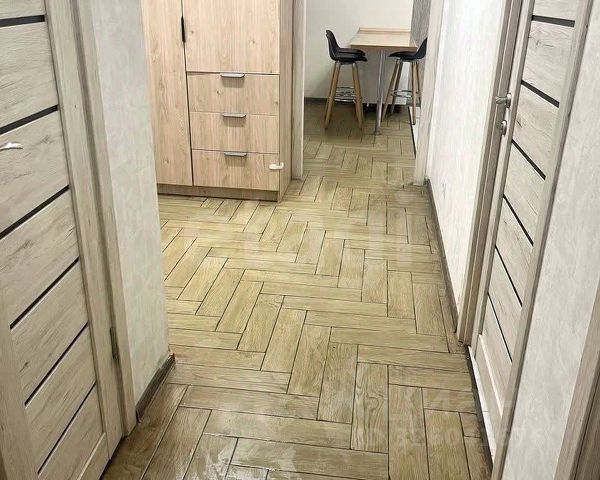 Покрытие пола керамогранит и ламинат. Потолки штукатурка. Стены выравнивали, оклеены обоями.