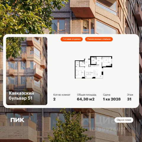 Продаётся 2-комн. квартира площадью 65 кв.м на 6 этаже 24 этажного дома (Корпус 3.5, Секция 2) проекта ПИК Кавказский бульвар 51. Светлый просторный подъезд на уровне земли, функциональная планировка, большие окна, предчистовая отделка. "Кавказский бульвар 51" — современный жилой квартал в районе Царицыно. Проект частично реализован. "Кавказский бульвар 51" находится в районе Царицыно, недалеко от одноимённого музея-заповедника. До метро "Кантемировская" — 17 минут пешком. За 20 можно дойти до станции "Чертаново". В 10 минутах на машине — МКАД, в 11 минутах — Варшавское шоссе, а в 16 минутах — ТТК. В проекте жилые дома высотой от 5 до 33 этажей, детский сад и школа. На первых этажах доступны магазины, кафе, салоны красоты и другие сервисы — чтобы купить кофе и свежий хлеб к завтраку, можно просто спуститься на лифте. В уютных дворах-парках есть места для отдыха и детские площадки. Для прогулок на свежем воздухе мы построим для жителей широкий пешеходный бульвар. В районе вокруг "Кавказского бульвара 51" есть всё для комфортной жизни: детские сады, школы, поликлиники, магазины и торговые центры. Девять минут на машине — и вы у музея-заповедника "Царицыно", где можно гулять среди исторических построек, лежать на траве под тенью деревьев или заниматься спортом на специальных площадках. Есть парки и поближе: до Аршиновского можно дойти за 8 минут, а до парка "Сосенки" — за 13 минут. Артикул 998530 (Застройщик АО "СПЕЦИАЛИЗИРОВАННЫЙ ЗАСТРОЙЩИК "ТОРГОВЫЙ ДОМ СПУТНИК")