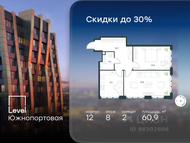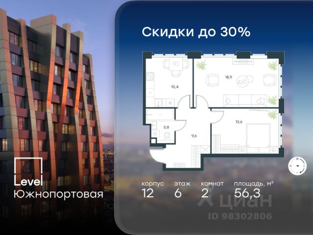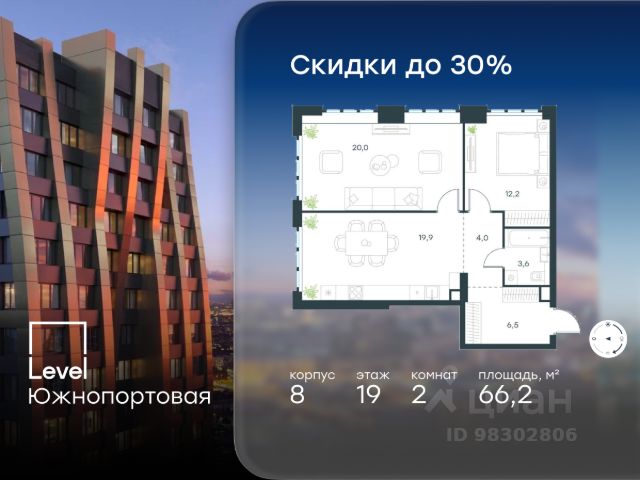 Цена указана с учётом скидки при 100%-й оплате, несубсидированной ипотеке, рассрочке (кроме программы "Рассрочка 0%"). В северной части района Печатники продается 2-комнатная квартира площадью 38.20 кв.м без отделки. Квартира расположена на 63 этаже 68-этажного корпуса 3 в жилом комплексе комфорт-класса Level Южнопортовая (компания Level Group/Левел групп). Отличная транспортная доступность: - 10 мин. пешком до станции метро "Кожуховская"; - 20 мин. пешком до станции МЦК "Дубровка"; - 3 мин. на авто до ТТК; - 13 мин. на авто до Садового кольца; - 15 мин. на авто до Бульварного кольца. Продуманный архитектурный проект: - авторская архитектура от бюро СПИЧ; - уникальные виды на реку, парки и достопримечательности города; - высота потолков в квартирах до 6 м; - окна высотой до 1,87 м с высоким коэффициентом сопротивления теплоотдаче. Расположение: Level Южнопортовая строится в северной части района Печатники - самой приближенной к центру. Здесь будет сформирован новый район "Южный порт", где построят крупный жилой и общественно-деловой центр, аналогичный Москва-Сити. В течение 10-12 лет в этом месте появятся не только жилые дома, но и развитая инфраструктура для жизни и работы. А еще совсем рядом находится набережная Москвы-реки, где планируется построить причалы для речных трамвайчиков и канатную дорогу. Уже сейчас вокруг жилого комплекса работают десятки магазинов и торговых центров, рядом расположено 6 парков, среди которых музей-заповедник "Коломенское". В 10 минутах пешком - 2 муниципальных и 2 частных детских сада, 7 общеобразовательных школ. Внутренняя инфраструктура: Для отдыха жителей в каждом корпусе предусмотрено лобби, оснащенное местами для отдыха, гостевыми санузлами и лапомойками, а в отдельных корпусах - камином. За счёт больших окон и высоких потолков пространства будут наполнены воздухом и светом. На первых этажах жилого комплекса откроются магазины, салоны красоты, фитнес-центр. Для детей строятся собственные детский сад и школа. Благоустройство: Внутренний двор комплекса разработан совместно с бюро GAFA. Основная идея - создать аналог Центрального парка в Нью-Йорке, гармонично сочетая высотные здания и большое изолированное парковое пространство. Вся площадь двора-парка будет огорожена и составит более 2 га, из которых 45% - озеленение. Одним из самых важных ландшафтных элементов здесь станет небольшая речка, наполняющаяся во время дождя. Вокруг неё появится сеть из островов, внутри которых расположатся тематические зоны спорта и отдыха. Технологии и инженерия: - автоматическая передача в управляющую компанию показаний квартирных счётчиков; - телефонная связь, телевидение и интернет на базе оптической мультисервисной сети; - гостевой Wi-Fi в лобби и на территории двора; - единый ключ доступа для входа на территорию комплекса.