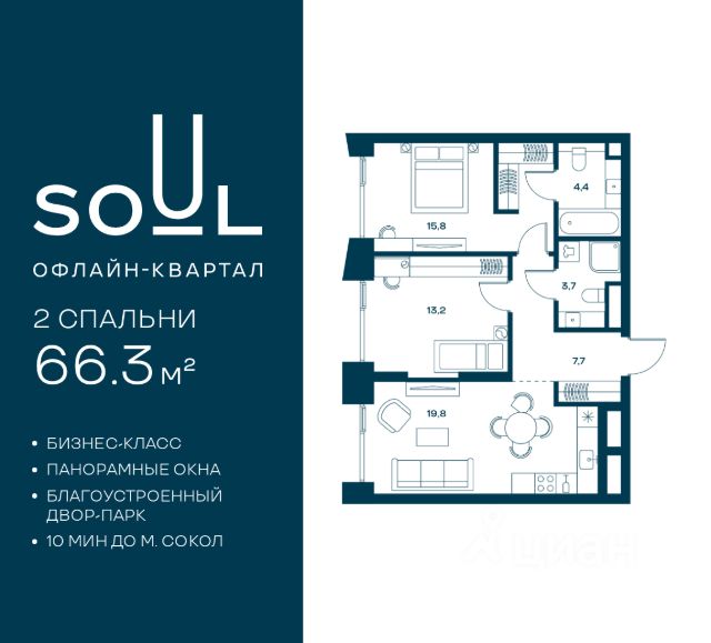 Цены указаны с условием 100% оплаты и стандартной ипотеки. Прямая продажа от застройщика! Продается 2-к. квартира номер 396 общей площадью 66.3 кв.м. на 17-м этаже 27 этажного дома, Корпус 4. С отделкой White Box Max. Проект бизнес-класса SOUL от девелопера FORMA. До метро Сокол 10 мин пешком. Архитектура от британского бюро SimpsonHaugh. Благоустройство дворов — Gillespies и GAFA. Территория состоит из культурного парка и приватных дворов. Озеленение в эстетике лесного оазиса. Насыщенное благоустройство: прогулочные тропинки, релакс-зоны, пряный и сенсорный сады, развивающие детские площадки и воркауты. В центре проекта объект культурного наследия — общественное пространство Изофабрика, построенная в 30-х годах по проекту архитектора Георгия Гольца. Здесь будут располагаться мастерские для взрослых и детей, выставочные залы, коворкинги, образовательный центр, рестораны и кафе. Квартиры с панорамными окнами, мастер-спальнями, гардеробными, классическими балконами и лоджиями, видовыми террасами. Высота потолков от 2,9 до 3,5 м. В проекте 2 детских сада на 100 и 200 малышей. Клубная гостиная, фитнес-рум, детская игровая комната, дизайнерские лобби, подземный паркинг и келлеры.