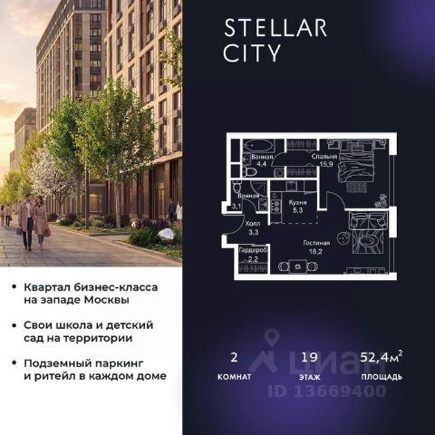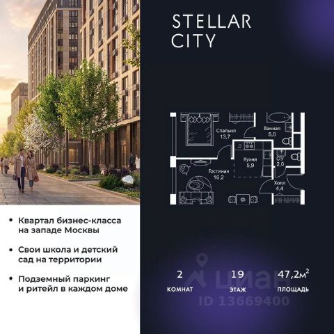 Продается квартира от надежного застройщика Tashir Estate в квартале бизнес-класса Stellar City в ЗАО Москвы. Площадь квартиры составляет: 61.2 кв. м, потолки: 3.1 м Квартира находится на 6 этаже, 4 корпуса жилого квартала Stellar City — микрогорода будущего на орбите Москвы. Stellar City — квартал в ЗАО Москвы вблизи инновационного центра Сколково. В окружении — 11 парков и природных зон, в том числе Долина реки Сетунь, Мещерский лес и парк развлечений The Rink. Город в городе Чтобы дом и инфраструктура вокруг отвечала динамичному лайфстайлу жителя мегаполиса, в основу проекта легла концепция город в городе, которая позволяет решать все бытовые вопросы in-home. В квартале будут возведены школа и детский сад, воркаут-зоны, променад, вело и беговые дорожки, детские площадки для каждого корпуса, а также коммерция на первых этажах для ежедневных покупок. Все необходимое — на расстоянии нескольких шагов. Изящные и лаконичные лобби Авторский дизайн, натуральные материалы в отделке и безупречный интерьер вне времени. Лобби и холлы в проекте бизнес-класса Stellar City ничем не отличаются от входных групп в премиум-сегменте благодаря качественным европейским материалам в отделке, стильному дизайну, консьерж-сервису и уютной зоне ожидания с журнальными столиками и мягкой мебелью. Комфорт и безопасность Закрытая территория, охрана, система СКУД, специально разработанное мобильное приложение дома для резидентов и подземный паркинг с круглосуточным наблюдением и доступом с помощью автоматического считывания номера авто.