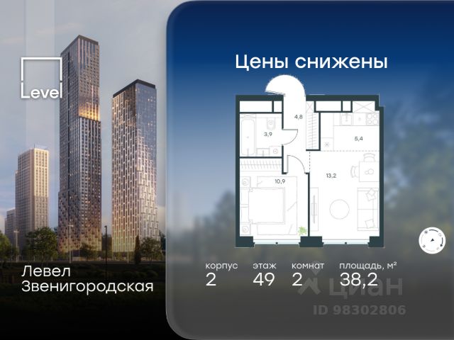 Цена указана с учётом скидки при 100%-й оплате, несубсидированной ипотеке, рассрочке (кроме программы "Рассрочка 0%"). В жилом квартале продаётся 2-комнатная квартира площадью 36.80 кв.м без отделки. Квартира расположена на 3 этаже 64 этажного корпуса 2 в жилом комплексе комфорт класса Левел Звенигородская (компания Level Group/Левел групп). Отличная транспортная доступность - 5 мин. пешком до метро "Звенигородская" (откроется к окончанию строительства); - 18 мин. пешком до станции МЦК "Хорошёво" и станции БКЛ "Народное ополчение"; - 4 мин. на авто до ТТК; - 8 мин. на авто до Садового кольца; - 15 мин. на авто до Кремля. Продуманный архитектурный проект - Концепция от студии Станислава Михаловского, в основу которой легло единение природы и города; - Двухкамерные стеклопакеты в окнах, алюминиевый и ПВХ профиль - в квартирах тепло зимой и прохладно летом; - С верхних этажей открываются панорамные виды на город, Москву-реку, "Москва-Сити" и Москворецкий парк; - Лобби со всеми удобствами: окна в пол, высокие потолки до 4,7 м, лаунж-зоны, колясочные, гостевые санузлы и мойки для лап животных; - Централизованные водонагреватели гарантируют круглогодичную подачу горячей воды в каждую квартиру. Благоустройство Концепция благоустройства разработана совместно с бюро UNK landscape. Высота башен приближается к 200 метрам - они словно касаются неба. Небесный простор проецируется на территорию двора с помощью подсветки, визуально увеличивая пространство и отражаясь в авторских элементах архитектуры. На территории площадью 0,45 га расположатся: - "Облако событий" - место встреч и общения; - "Облако спорта" - всё для поддержания себя в форме; - "Облако принятия решений" - пространство для работы на свежем воздухе; - "Облако спокойствия" - для отдыха в тишине природы; - "Облако игр" - площадки для подростков и самых маленьких. Инфраструктура В жилом комплексе откроется 21 коммерческое помещение: продуктовые лавки, кафе, салоны красоты, службы доставки и творческие студии. Этап 1 включает строительство двухуровневого подземного паркинга. Всего здесь расположится 351 машино-место, включая семейные места, и 264 кладовых помещения. В распоряжении жителей развитая инфраструктура района: 15 супермаркетов, 5 спортивных объектов, 9 медучреждений, 7 детских садов, 4 школы, 3 благоустроенных парка - всё в шаговой доступности. Инженерия Комфортное перемещение внутри домов будут обеспечивать надёжные лифты с доступом в паркинг с жилых этажей. В каждом корпусе предусмотрено до шести кабин, включая сервисные лифты. Попасть на территорию комплекса можно только по единому ключу доступа. Видеонаблюдение установлено на входах в подъезды, в лобби, в общих зонах, на въезде в паркинг. Гости смогут связаться с жителями дома через входные видеопанели, а управлять доступом на территорию можно через видеодомофон или приложение на телефоне. Купить 2-комнатную квартиру элитные на шоссе Шелепихинское в Москве.