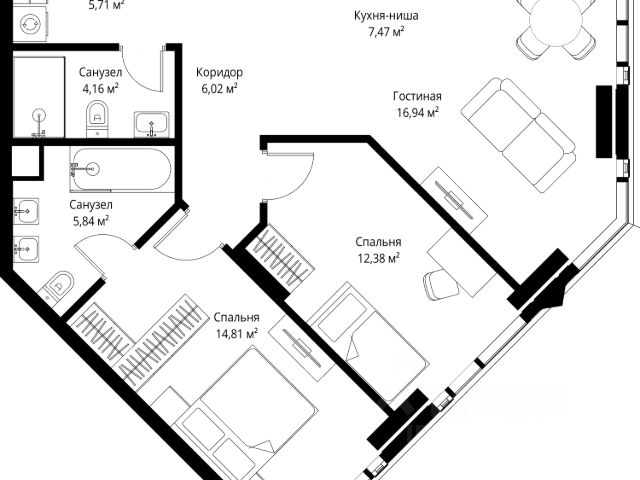 • ✅ Минимальная площадь: 33,9 м²