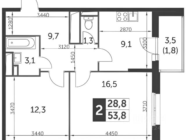 Общая площадь 63 кв.м., жилая площадь 45,4 кв.м. (20 кв.м. + 15 кв.м. + 10,4 кв.м.) зал проходной, кухня площадью 6,5 кв. м., сан/узел совместный, балкон застеклён. Окна ПВХ, выходят на обе стороны дома. Высота потолков — 2,7 метра.