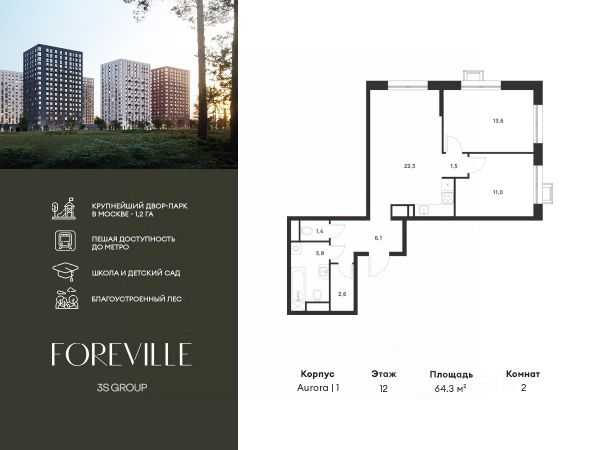Пешая доступность от метро и московская прописка! Продается уютная 2-комн. квартира площадью 64,8 кв.м на 9 этаже 17 этажного жилого комплекса бизнес-класса Foreville от 3S Group. Общая площадь: 64,8 кв.м., жилая: 39,8 кв.м., площадь кухни-гостиной: 22,3 кв.м., высота потолков: 2,72 м., окна выходят во двор и на улицу. [1] Квартира предлагается без отделки, что идеально подходит для воплощения собственного дизайнерского решения. Также доступна опция предчистовой отделки, стоимость которой включается в общую цену квартиры. О проекте: Пространство Комплекс располагает крупнейшим приватным двор-парком в Новой Москве площадью 1,2 Га, предлагая жителям огромное пространство для отдыха, спорта и игр на свежем воздухе. Природный ландшафт Внутренний лесопарк с более чем 183 взрослыми деревьями и 10 320 цветущими кустарниками создает уникальную природную атмосферу для каждого времени года. Игровые и спортивные зоны Обширные площадки с безопасным покрытием, специализированные зоны для детей разных возрастных групп и взрослых, включая воркаут и настольный теннис, способствуют активному и здоровому образу жизни. Экологичность и долговечность Использование натуральных материалов, таких как лиственница, и крупноформатной бетонной плитки для покрытия, подчеркивает стремление проекта к экологичности и устойчивости. Безопасность и уединение Внутренний двор без машин обеспечивает безопасность для детей и спокойствие для взрослых. Территория огорожена и находится под круглосуточным видеонаблюдением. Сохранение времени Благодаря превосходной транспортной доступности и близости к новой станции метро Корниловская, Foreville позволяет жителям экономить время для семьи и отдыха на природе, минимизируя необходимость длительных поездок. Foreville не просто жилье, а целая экосистема для комфортной и гармоничной жизни на свежем воздухе, совмещая преимущества городской инфраструктуры и непосредственную близость к природе.