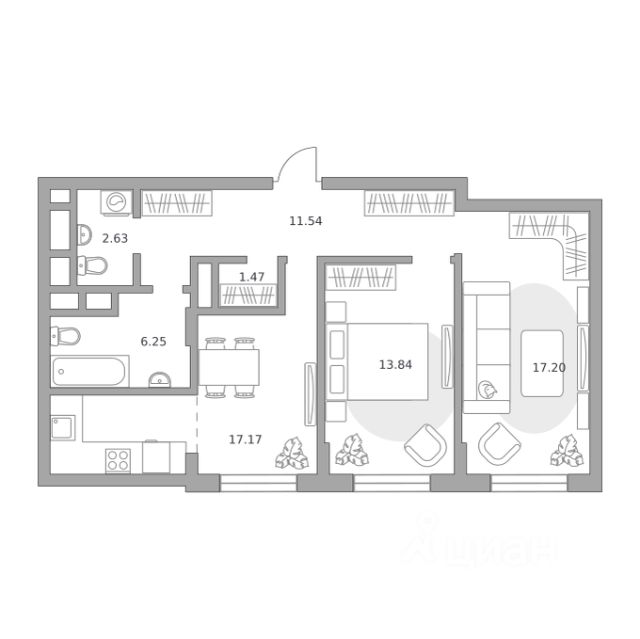 Продаётся 2-комнатная квартира 350, площадью 57,99 м², на 1 этаже в ЖК "Живописный" корпус 2.2. Стоимость — от 11235830 руб. Квартира без отделки, планировка односторонняя, окна во двор.