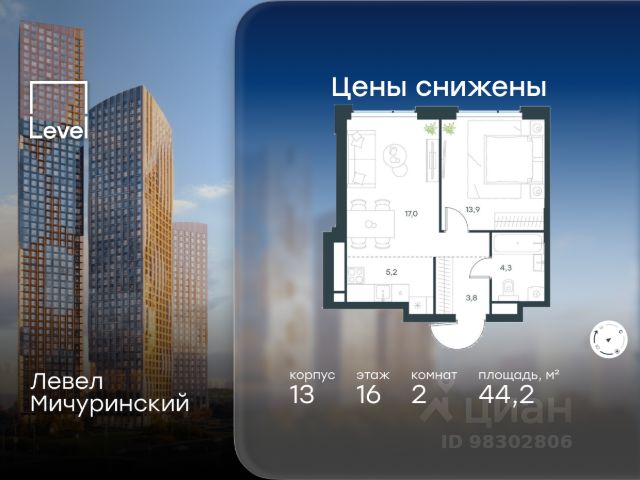 В жилом квартале, расположенном на границе с природным заказником "Долина реки Очаковки", продаётся 2-комнатная квартира площадью 44.20 кв.м без отделки. Квартира расположена на 16 этаже 31-этажного корпуса 13 в жилом комплексе бизнес-класса Левел Мичуринский (компания Level Group/Левел групп).