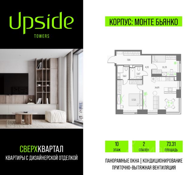Продаётся 2-комнатная квартира площадью 67.8 кв.м на 10 этаже 55 этажного корпуса Эльбрус в квартале небоскребов "Upside Towers". В квартире отделка White-box, c видом на детский сад, БЦ Останкино. Номер квартиры А1004. Upside Towers - технологичный квартал строится в динамично развивающемся Бутырском районе, в 3 мин. от метро, в 5 мин. от ТТК. На территории 7 га возводится 5 высотных башен от 19 до 58 этажей, названных в честь главных вершин земли. Квартиры с панорамными окнами в пол, высокими потолками и современными инженерными решениями. Благоустроенная зеленая территория включает: приватные дворы, природный комплекс, прогулочный бульвар, ландшафтный парк 2,5 га с сенсорным садом и многофункциональными игровыми и спортивными площадками. Большое внимание в проекте уделяется созданию социальной инфраструктуры. Более 2000 кв.м. отдано под Upside club закрытый клуб, уникальное пространство для общения и развития жителей квартала, включая SKY SPA Relax на 47 этаже башни "Атлас" расслабляющей атмосферой, джакузи, сауной, залами для релаксации и йоги доступное жителям Upside Towers, всесезонное барбекю-патио, лаундж зону с камином и роялем, многофункциональные игровые пространства, домашний кинотеатр, коворкинг и переговорные. В башнях откроются смотровые террасы для резидентов с панорамными видами на город, парки, Останкинскую башню, ВДНХ, Ботанический сад и Москву-Сити. В рамках проекта строится государственная школа и детский сад, разместится более 15 000 кв.м. коммерческой инфраструктуры. Насыщенная социальная инфраструктура формирует множество сценариев для жизни на территории квартала. В Upside Towers применяются лучшие технологии и практики, чтобы обеспечить высшее качество жизни: Воздух, не уступающий по качеству горному, обеспечит приточно-вытяжная вентиляция. Пятиступенчатая очистка воды с сохранением полезных минералов. Центральное кондиционирование. Внутрипольные конвекторы с естественной конвекцией. Современные системы безопасности и мониторинга микроклимата. Высокоскоростной интернет на всей территории, в квартирах и паркинге за счет усиления GSM-связи всех ведущих операторов. Все места в подземном паркинге оборудованы зарядками для электрокаров. Бутырский район непрерывно развивается и готовится стать новым современным деловым районом Москвы. В рамках программы "Индустриальные кварталы" комплексного развития территории Огородного проезда будут построены современные образовательные и спортивные учреждения, торговые центры, кафе, банки, общественно-деловые здания и другие объекты. В пешей доступности работают школы, детские сады, поликлиники, аптеки, супермаркеты и многое другое. Рядом находится несколько крупных зелёных зон для спокойного отдыха: Парк Останкино, ВДНХ, Парк Сокольники, Гончаровский парк, в 15 минутах пешком располагаются знаменитые арт-пространства - дизайн-завод Flacon и "Хлебозавод". Время в пути на автомобиле до центра Москвы 15 минут. (Застройщик ООО "СЗ "К-Девелопмент")