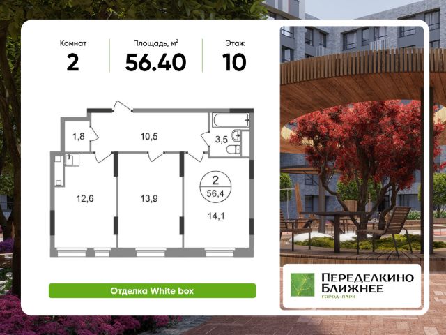 Продается двухкомнатная квартира в городе-парке "Переделкино Ближнее". Общая площадь квартиры - 47,4 кв. м, этаж 10 из 17. Срок сдачи - 1 квартал 2028 года. Тип дома - монолитный. Корпус расположен в новой 13 фазе строительства и состоит из 8 секций с переменной этажностью 12-17 этажей. Все секции без отделки. Около 13 фазы запланировано строительство многоуровневого паркинга на 300 м/мест. 13 фаза имеет уникальное расположение и находится непосредственно на берегу Федосьинского пруда, который является сердцем города-парка "Переделкино Ближнее". Город-парк "Переделкино Ближнее" расположен в 8 км от МКАД по Боровскому шоссе. ТРАНСПОРТНАЯ ДОСТУПНОСТЬ: - 15 минут пешком до станции МЦД-4 "Мичуринец" - 25 минут пешком до станции метро "Рассказовка" Солнцевской линии - 30 минут до центра Москвы - 2026 г. - открытие трассы Солнцево-Бутово-Варшавское шоссе РАЗВИТАЯ СОЦИАЛЬНАЯ ИНФРАСТРУКТУРА: - 7 детских садов, 3 школы - банки, продуктовые магазины, аптеки, фитнес центры, салоны красоты и пр БЛАГОУСТРОЙСТВО: - дворы без машин - игровые зоны и развивающие детские площадки - зоны для созерцательного и медитативного отдыха - зоны для занятий спортом ОСОБЕННОСТИ АРХИТЕКТУРЫ: - высокие потолки от 3,03 м - безбарьерные входные группы - колясочные в каждой входной группе - кладовые помещения расположены на -1 этаже каждой секции - в каждой секции 2 лифта: 1 пассажирский, 1 грузовой - на фасаде предусмотрены корзины для установки кондиционеров АВТОРСКИЙ ДИЗАЙН: Входные группы выполнены по авторскому дизайну, благодаря панорамному остеклению наполнены естественным светом. В каждой входной группе будет располагаться комфортабельная зона ожидания с возможностью зарядить электронные устройства, почтовые ящики, колясочная, акцентные пуфы и столик.