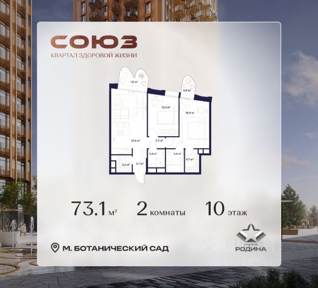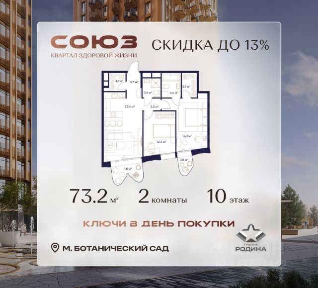 Готовые дома и ключи в день покупки Рассрочка 0% Продаётся 2-комнатная квартира площадью 73.2 м² на 10 этаже в Жилом Комплексе "Союз". Квартал здоровой жизни премиум-класса с рекордным количеством олимпийских видов спорта: - Ледовая арена для хоккея и фигурного катания, - Футбольные поля для тренировок, - Спортивный зал для фехтования, - Бассейн на 6 дорожек, - Центр единоборств, - 4 крытых площадки для настольного тенниса, - 7 теннисных кортов (крытых и открытых), - 4 крытых площадки для сквоша, - Легкоатлетический стадион, - Площадки для баскетбола и волейбола. Уникальные форматы квартир с мастер-спальнями, приватными террасами, балконами, а также пентхаусы с открыточными видами на город. Все квартиры продаются с отделкой Shell&Core и панорамным остеклением. Расположение Пешком: - 2 мин. до парка "Сад Будущего"; - 6 мин. до ст. м. ""Ботанический сад""; - 6 мин. до ст. МЦК ""Ботанический сад ""; - 6 мин. до парка "Леоновская роща"; На автомобиле: - 2 мин. до СВХ (МСД); - 5 мин. до Проспекта Мира; - 10 мин. до ТТК; - 15 мин. до Садового кольца; - 25 мин. до аэропорта ""Шереметьево"". Благоустройство - собственная спортивная инфраструктура 7 Га; - зона для пикников; - игровые и спортивные площадки для детей всех возрастов; - розарий, а также сосновые, каштановые и дубовые аллеи; - площадки под открытым небом для занятий спортом и йоги; - игровые комнаты для детей; - лаунж-зона для резидентов; - просторная переговорная для деловых встреч; - премиальный ресторан "Шабада" Сосо Павлиашвили с водными арт-объектами на прогулочной аллее, садом ароматных трав и сценой под открытым небом; - кафе, химчистки, аптеки и супермаркеты рядом с домом. Окружение - 8 парков: Сад Будущего, Леоновская роща, Хуамин, Главный ботанический сад РАН, Шереметьевская дубрава, Останкино, парк спорта "Яуза", пойма реки Яуза и музей-усадьба "Останкино"; - 3 ВУЗа: ВГИК, РГСУ, МГПУ; - 12 школ, в том числе: школа 1499 им. И.А. Докукина (топ 100), Brookes Moscow, IThub школа; - 18 детских садов, в том числе билингвальный ALERTUM KIDS; - один из крупнейших океанариумов Европы "Москвариум"; - один из крупнейших в Европе торгово-развлекательных центров "Европолис".