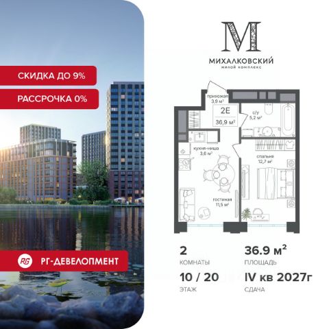 Ипотека для каждого! Полная стоимость кредита от 11,578% до 22,490%. Ставка от 0,11% в АО "Альфа-Банк" фиксируется на 1 год с даты заключения кредитного договора, далее полная стоимость кредита от 25,819% до 28,767% ставка 21,59% до окончания срока кредитования. Первоначальный взнос — от 20% от стоимости квартиры. Срок кредитования — от 3 до 30 лет. Скидка 9% при покупке квартиры! Продаётся 2-к квартира 38,0 кв.м. в ЖК "Михалковский" на 10-м этаже 20 этажного дома. Компания "РГ-Девелопмент" предоставляет скидки на квартиры в жилом комплексе. Акция действительна с 12.09.2024 г. до 30.11.25г. включительно. Для того чтобы воспользоваться предложением, необходимо подписать договор на приобретение недвижимости до 30.11.25г., включительно. Рассрочка 0% + Скидка 5%. При приобретении дольщиком квартиры в любом из двух данных корпусов с использованием способа оплаты "Рассрочка 0%", у покупателя также есть право воспользоваться скидкой в размере 5% от полной стоимости квартиры. Условия программы рассрочки: Первый платеж составляет 20% от стоимости объекта и вносится при заключении ДДУ. Второй платеж в размере 20% от стоимости объекта вносится по истечении 12 месяцев со дня подписания ДДУ. Оставшаяся сумма, в размере 60%, выплачивается за месяц до планового срока ввода ЖК в эксплуатацию, то есть не позднее 31.05.2027. Действует на приобретение квартир в корп. 2, 7. Действует программа "Растет семья - растет и квартира". Прямая продажа от застройщика! Старт продаж новых корпусов. Квартиры без отделки. Срок сдачи IV кв. 2027г. Особенности проекта: Завораживающие виды Красивое благоустройство Уникальная локация для Москвы (рядом Головинский парк, пруды, усадьба Михалково) Рядом с центром В проекте присутствует: архитектура голландского бюро MLA+, зеленые зоны, транспортная доступность, благоустроенная территория, подземный паркинг, детский сад и выход на Головинский парк с пятью прудами. Название комплекса указывает на одну из его черт - соседство с имением Михалково. Позвольте себе жить в месте, где проводили свой досуг династии Дашковых и Паниных.