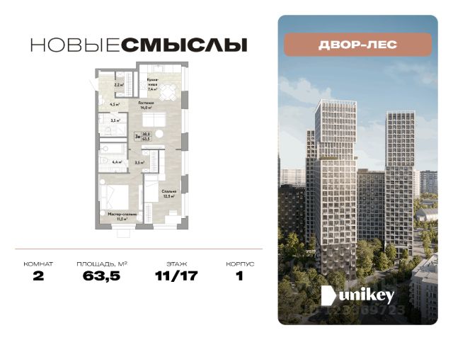 В жилом комплексе, расположенном по соседству с ландшафтным парком "Южное Бутово", продается 2-комнатная квартира площадью 65.10 кв. м. без отделки. Квартира расположена на 11 этаже 1 корпуса в жилом квартале комфорт-класса "Новые Смыслы" (ГК Unikey/Юникей). Доступная и удобная локация: - 10 минут ходьбы до станции метро "Потапово". - 25 минут ходьбы до станции метро "Бунинская аллея". - 15 минут на авто до Калужского шоссе. - 20 минут на авто до МКАД. - 30 минут на машине до аэропортов "Внуково" и "Остафьево". Продуманный архитектурный проект: - Разноуровневые секции с эстетичные башнями и контрастными цветовыми сочетаниями, напоминающими башни в Сити. - Сказочные виды из окон на современный район столицы. - Авторские планировки с потолками в 3 метра, просторными кухнями-гостиными и мастер-спальнями. - Комфортные бесплатные общественные пространства. - Подземный паркинг с прямым доступом на лифте. - Настоящий лес с живописными пейзажами и прудом прямо во дворе. Расположение Комплекс "Новые Смыслы" расположится в благоприятном районе Новой Москвы - Коммунарка. Зеленое окружение, богатая инфраструктура развивающегося района - все это сформирует особое пространство для комфортной жизни, наполненной смыслом. 10 минут на велосипеде - и вы в ландшафтном парке "Южное Бутово" или сквере у Потаповских прудов. Чуть дальше расположен Бутовский лесопарк. В окружении "Новых Смыслов" вы найдете все необходимые социальные объекты. В двух шагах от дома находится 5 школ, более десятка детских садов, секции для занятий малышей и подростков, частные клиники, супермаркеты, рестораны, студии красоты и фитнес-центры. За 12 минут на авто вы доберетесь до ледовой арены, комплекса "Спорт Станция" и спа-центра "Termoland". Внутренняя инфраструктура Для жителей "Новых Смыслов" будут созданы бесплатные общественные пространства: - Деловая гостиная с эстетичным коворкингом и переговорными. - Гостиная для души и тела, включающая фитнес-зону с тренажерами и пространства для стретчинга, йоги и медитаций. - Гостиная детства, где дети будут играть и развиваться под присмотром тьютора. - Кино-гостиная - кинотеатр на крыше одного из домов, предлагающий разнообразную программу. - Прачечная, работающая только для жильцов. Вместе с корпусами комплекса на территории запланировано строительство детского сада. На первых этажах корпусов откроются кофейни, пекарни, сервисы быта и пункты доставки. Благоустройство Чтобы отдохнуть от суеты города, достаточно выйти во двор: здесь раскинулся настоящий лес с живописными пейзажами. В тени деревьев жителей ждут пруд с мостиком и беседкой на берегу, тихие прогулочные аллеи, спортивная площадка и зоны для занятий йогой и бадминтоном на свежем воздухе. Юных жителей порадуют современные детские площадки, жукарий и специальное пространство для подвижных игр. Безопасность на территории гарантирована: двор огорожен от машин и оснащен камерами видеонаблюдения.