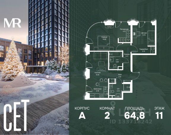 Прямая продажа от застройщика. В ЖК Сет продается 2-комнатная квартира площадью 55.61 м², расположенная в корпусе А, на 11 этаже 52 этажного дома. Сет имеет стратегически выгодное расположение в ЗАО, в районе с большой историей и блестящим будущим: между природной зоной долины реки Сетунь и Кутузовским проспектом. В рамках возведения первой очереди предусмотрено три корпуса высотой 18, 45 и 59 этажей. На верхних этажах спроектированы общедоступные смотровые площадки с панорамным обзором на центр столицы. Преимущества проекта: • Функциональные планировочные решения • Контроль проникновения через входную дверь • Система управления освещением и температурой в квартире • Система защиты от протечек с функцией перекрытия воды • Вход в подъезд по биометрическим считывателям Face ID • Скоростные лифты • Двухуровневый подземный охраняемый паркинг на 495 машино-мест Застройка Сет включает в себя не только жилые корпуса, но и инфраструктурные объекты. Все необходимое для повседневного комфорта будет расположено в шаговой доступности: • Фитнес-клуб с бассейном • Ведущая городская школа, детский сад и школа искусств • Центр культуры и досуга • Медицинский центр • Кафе и рестораны Расположение комплекса: Пешком: • Метро "Давыдково" - 17 минут • Парк "Долина реки Сетунь" - 3 минуты • Открытие новых станций метро в шаговой доступности в будущем Инфраструктура: Разнообразить свой день резиденты Веер смогут также проводя больше времени на свежем воздухе. Двор разделен на 4 зоны разных эмоций и действий, которые пересечены и соединены веерными прогулочными маршрутами: • Спортивная площадка устроена в глубине ""Кленовой рощи"" • В ""Чайном домике"" будет создан навес с утеплением для отдыха в любую погоду • Площадки для детей воплотятся в ""Волшебный лес"" с цветами, зеркалами и световым дизайном • ""Центральная площадь"" устроена у водного оазиса живописного пруда. На машине: • "Москва-Сити" - 15 минут • Садовое кольцо - 20 минут • ТЦ "Океания" - 8 минут • ТЦ "Времена года" - 13 минут • Сколково - 12 минут • Гребной канал - 17 минут Компания MR предлагает своим клиентам специальные условия приобретения квартир в рамках программ ипотечного кредитования от банков-партнеров.