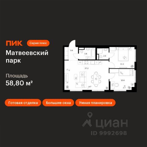 О квартире Продаётся 2-комнатная квартира общей площадью 54.5 кв.м. без отделки. Квартира расположена на 11 этаже корпуса 5.5 в жилом комплексе бизнес-класса "Среда на Лобачевского" в пешей доступности от метро "Аминьевская". О жилом комплексе "Среда на Лобачевского" полностью соответствует критериям современного жилого пространства. Взяв за основу рациональный подход, мы гармонично соединили дизайн, актуальные тренды и функциональность. Продуманный современный экстерьер и функциональные планировки внутри, приватные пространства и разнообразные досуговые зоны для каждого члена семьи — все это "Среда на Лобачевского". Инфраструктура Район отлично развит и наполнен жизнью, здесь уже есть вся необходимая инфраструктура — детские сады, школы, медучреждения, торговые центры, благоустроены парки для прогулок и отдыха, удобен и легкодоступен городской транспорт. Рядом расположены учебные корпуса крупных университетов — МГУ, МГИМО и РАНХиГС. Школы и детские сады в районе занимают высокие позиции в городских рейтингах, поэтому вам не придется беспокоиться о качестве образования детей. Как и об отдыхе: поблизости расположены живописные пруды, реки и парки. Это Парк Олимпийской деревни, Парк имени 50-летия Октября, Мещерский парк и Очаковские пруды. Теперь поставить галочки в еженедельном чек-листе "спорт-прогулки-встречи с друзьями" можно, не покидая любимый район. Особенности Особое внимание в проекте уделяется созданию функциональных пространств не только внутри дома, но и за его пределами. В ландшафтном парке "Среды на Лобачевского" расположены крытые зоны для спокойного времяпровождения, места для активного отдыха и спорта, коворкинг, соседский комьюнити-центр, водные объекты. —Ландшафтный парк во дворе. —Водный сад с зонами отдыха. —Зоны коворкинга. —Дизайнерские гранд-лобби. —Бесключевой доступ. —Подземный паркинг.