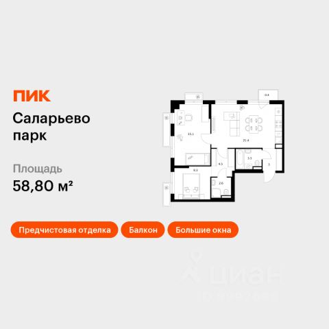 Продаётся 2-комн. квартира площадью 58,1 кв.м на 11 этаже 16 этажного дома (Корпус 2.6/1.1, Секция 1) проекта ПИК Бунинская набережная. Светлый просторный подъезд на уровне земли, функциональная планировка, большие окна, c отделкой. Удобное расположение: 18 минут пешком от м. "Потапово" и 12 минут на автомобиле до станции "Бунинская аллея". 12 минут на автомобиле до трассы Солнцево — Бутово — Варшавское шоссе. 20 минут на автомобиле до МКАД и Калужского шоссе. 1520 минут езды до живописных парков: "Бутовский лесопарк", заказник "Южное Бутово". Особенности проекта Камерный квартал в Новой Москве, на берегу Ивановского пруда. Одна из ключевых особенностей проекта — квартиры с панорамным видом на воду. Архитекторы вдохновились локацией проекта: природные оттенки и активная пластика корпусов напоминают рельефные выступы на берегу, а окна отражают водную гладь, визуально объединяя дома с природой. Преимущества проекта Светлые и просторные лобби с зонами ожидания. Подземный паркинг. Набережная и пешеходная аллея для прогулок. Парк на склоне с игровой зоной. Готовая инфраструктура района: 3 школы, 6 детских садов, взрослая и детская поликлиники. Артикул 968408 (Застройщик ООО СЗ "Стройком")