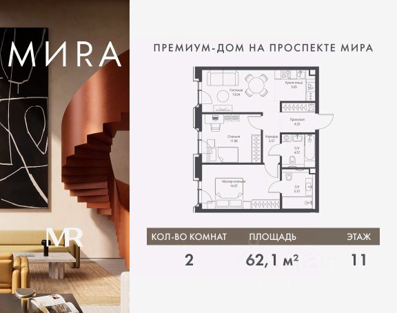 Прямая продажа от застройщика. Продаётся 2-комнатная квартира общей площадью 62.10 м² без отделки в доме премиум-класса МИRА на 11-м этаже 23 этажного дома. Квартира расположена в корпусе 2. Дом премиум-класса МИRA это: • Спокойный район с богатой историей и сложившейся инфраструктурой • Авторская архитектура на стыке классики и современности • Вход в парк прямо из жилого комплекса • Панорамные виды на Яузу, парки, ВДНХ и скульптуру "Рабочий и колхозница" • Удобные сервисы и безопасность для каждого резидента Расположение: Жилой квартал расположен в Алексеевском районе на северо-востоке Москвы, на второй линии домов, таким образом вы сможете дистанцироваться от шума и суеты проспекта Мира, но при этом будете жить недалеко от этой важной городской магистрали. Прямо у дома: • Парк Акведук • Река Яуза • Памятник "Рабочий и колхозница" Пешком: • 16 мин м. ВДНХ На автомобиле: • 12 мин ТТК • 15 мин Садовое кольцо • 12 мин Национальный парк "Лосиный остров" Благоустройство: Концепция благоустройства от бюро "ДРУЖБА" разработана в стиле "Лесная тропа". В уютном дворе расположились словно затерянные в лесу, площадки для отдыха. Они разделяются островками с травами, кустарниками, крупными камнями и деревьями, между которыми проходят узкие песчаные тропинки с деликатной подсветкой по вечерам. Центральной точкой притяжения для жителей станет главная площадь с фонтаном, которая открывается сразу из двух входных групп. Внутренний двор МИRA: • Детская площадка с зонами для игр малышей до трех лет и детей более старшего возраста • Спортивная площадка с профессиональным оборудованием для тренировок • Декоративные перголы • Воздушный арт-объект с подсветкой, похожий на облако • Чайный домик, где в отдельном отапливаемом павильоне можно в любое время года попить кофе с соседями или устроить камерное семейное чаепитие • Зоны для работы и отдыха с гамаком под навесом, скамейками и креслами Инфраструктура и окружение: В Алексеевском районе есть огромные благоустроенные парки, магазины, гимназии с высоким рейтингом и филиалы ВУЗов, частные и государственные детские сады, модные кофейни и фитнес-центры. В квартале МИRА предусмотрены: • 2 ресторана с видом на парк Акведук • 3 кафе • фитнес-студия • подземный паркинг на 330 машино-мест Компания MR предлагает своим клиентам специальные условия приобретения квартир в рамках программ ипотечного кредитования от банков-партнеров.