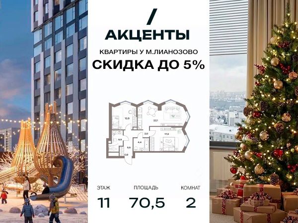 Трехкомнатная евроквартира для большой семьи. -Мастер-спальня с личной ванной и местом для системы хранения -Отдельная уютная детская комната -В квартире предусмотрено классическое остекление с эркерами -Второй санузел для удобства каждого члена семьи -Просторная кухня-гостиная в центре квартиры для семейных торжеств -Удобная ниша в коридоре для системы хранения Молодой район для жизни "Акценты" в классе бизнес-лайт — точка роста на севере Москвы. Он предлагает элегантные и строгие фасадные решения, авторский ландшафтный дизайн, а также функциональные и доступные по цене планировки. Проект находится в семи минутах пешком от станции метро "Лианозово" и одноименной МЦД-1. Добраться до МКАД можно будет за 10 минут на авто, а дорога до центра займет около 20 минут. Жилой комплекс, расположенный в районе Восточного Дегунино, предлагает развитую инфраструктуру для тех, кто ценит выбор. Он имеет удобный доступ не только к транспорту, но и к паркам, школам, садам, больницам и другим социальным объектам. В пешей доступности находятся 4 поликлиники, 5 школ, 6 детских садов, 3 бассейна и баскетбольная академия. Еще рядом есть несколько лесопарков: "Лианозово" с аттракционами и спортивными площадками для тенниса, волейбола и баскетбола, "Останкино" с конным клубом, прудом и пейнтбол-площадками. А "Северные Дубки" — это завораживающее пространство для прогулок под кронами вековых дубов, берез и лип. Кроме того, в районе не будет скучно и юным жителям. Можно оттачивать трюки в скейтпарке "Союз". Ловким и прыгучим советуем записаться в акробатический центр "Белка".