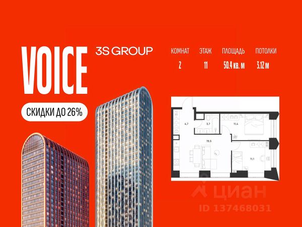 Ипотека от 3,5% на весь срок. Дополнительная скидка в офисе продаж! Продается уютная 2-комн. квартира площадью 54,8 кв.м на 11 этаже жилого комплекса бизнес-класса Voice Towers от 3S Group. Общая площадь: 54,8 кв.м., жилая: 38,4 кв.м., площадь кухни-гостиной: 17,6 кв.м., высокие потолки: 3,12 м., санузел совмещенный. О проекте: Voice. Высокие стандарты жизни Мы уверены, что высокие идеалы неизменно помогают достигать высот. Создавая Voice, мы ориентировались на людей с высокими требованиями к качеству и безупречным вкусом. Башни жилого комплекса, сочетают элегантную форму с динамичной геометрией фасадов, устремляются ввысь и отвечают самым высоким стандартам строительства. Технологичность, воплощенная в архитектуре - это ваш, собственный Voice. Преимущества локации Близость к метро Текстильщики, БКЛ и МЦК Новохохловская (10 мин) Рядом природный заповедник и конно-спортивная база Кузьминки-Люблино Будущее окружение Проект Южный порт - Текстильщики с деловым центром Сити-2 Небоскребы высотой до 300м Культурный центр с амфитеатром Променад вдоль Москвы-реки и яхт-клуб Архитектура Проект от Архитектурной мастерской Алексея Ильина Две перпендикулярные башни с арочными вершинами Высокая башня: светло-серый металл Низкая башня: терракотовая керамика Благоустройство Внешняя зона: парковки, магазины, кафе Внутренний двор: закрытая территория с озеленением Шумозащитный экран Сезонное озеленение Встречи на высоте Гранд-лобби высотой 8м Дизайнерская мебель Умные скоростные лифты Услуги Детский центр с игровой зоной Фитнес-студия для жителей