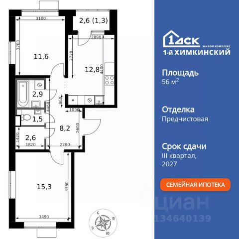 Прямая продажа от застройщика! Жилой Комплекс класса Комфорт. Продаётся 2-к квартира номер 606 общей площадью 56.2 кв.м. на 12-м этаже 16 этажного здания. Предчистовая отделка. Цена с учётом скидки. Особенности квартиры: - Организуем показ в удобное для вас время! - Распашная планировка - отличное сочетание удобства и свободы. - Раздельный санузел - больше удобства для всех членов семьи. - Гардеробная - удобство для хранения и организации вещей. - Лоджия - уютное место для отдыха и тишины. Квартира с предчистовой отделкой. Вам не придется заниматься черновыми и трудоёмкими работы, а чистовую отделку и дизайн - сделайте на свой вкус. Информация о комплексе: "1-й Химкинский": гармония современного города и природы на 102 га у Химкинского леса и канала им. Москвы. Развитая инфраструктура: ТЦ, школы, спорткомплекс с термами и СПА, парк развлечений. Идеальный баланс для жизни в окружении зелени и городского комфорта. Транспортная доступность: ЖК "1-й Химкинский" дает возможность выбрать любой способ передвижения как до города, так и до самых разных объектов, которые могут представлять интерес для его жителей. Не важно, какой способ передвижения вы предпочитаете, успевать всегда и везде можно вне зависимости от выбора транспорта. - 8 мин. пешком (800 м) до остановки "Золотая Арка" -10 мин пешком (1 км) до остановки "Поворот на Ивакино" Внутренняя инфраструктура: Безопасность: закрытые дворы без машин, безбарьерная среда, сквозные подъезды, камеры на детских площадках с трансляцией на смартфон. Отдых: семейный парк развлечений, двухэтажный ТЦ 8 000 м² с фудкортом. Образование: 4 детских сада, 2 муниципальные школы. Спорт: закольцованный веломаршрут, спорткомплекс с термами, тренажерный зал, воркаут зоны. Инфраструктура: поликлиника со станцией скорой помощи, пожарное депо. Паркинг: подземный паркинг, кладовые на -1 этаже, СТО и автомойка на территории. Квартира с предчистовой отделкой - ваш дизайн без черновых работ