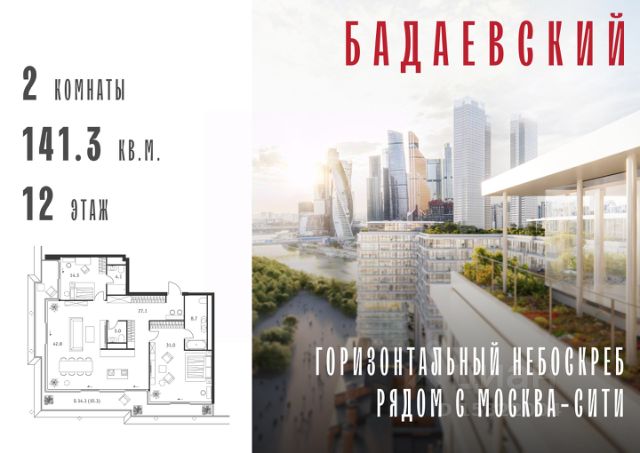 Продаётся 2-комнатная квартира общей площадью 70.00 м² на 12 этаже Жилого Комплекса Бадаевский. О нем говорили. Его ждали. Жилой комплекс "Бадаевский" на Кутузовском проспекте — это место для жизни, которое займет место в истории. Комплекс стал первым в истории московским проектом, победившим в категории Residential на World Architecture Festival. Девелопер Capital Group. В "Бадаевском" исторические здания завода и футуристические "парящие" дома создают единый комплекс, который станет новой достопримечательностью и символом Москвы. Панорамное остекление, террасы и веранды дарят неординарные и захватывающие виды. Благодаря расположению домов и панорамному остеклению, жилые пространства в "Бадаевском" будут наполнены светом. А виды из окон домов-"лент" на Москву-реку, пивоваренный завод, небоскребы "Москва-Сити" и Белый дом дополнены принципиально новым ощущением высоты. На территории Бадаевского завода появится масштабный ландшафтный парк с концепцией "русский лес". Впервые в истории района Дорогомилово у жителей появится прямая связь набережной Тараса Шевченко с Кутузовским проспектом. Близость Москвы-реки добавляет к преимуществам "Бадаевского" природную энергетику и приятные прогулки на свежем воздухе. Подземная парковка позволит сделать территорию завода полностью пешеходной, а сам комплекс представит новый подход к организации открытого и уединенного пространства в центре Москвы. Расположение в начале Кутузовского проспекта делает проект не только престижным, но и удобным: до Третьего транспортного и Садового кольца можно доехать за 5 минут, а Кремль и основные исторические достопримечательности расположены в 15 минутах на автомобиле. Напротив "Бадаевского" находится офисный кластер "Москва-Сити". Для жителей комплекс будет создано не только новое масштабное благоустройство, но и вся необходимая инфраструктура. В исторических корпусах появятся магазины, бутики, кафе и рестораны, коворкинг и крафтовая пивоварня, а в зданиях элеваторов — русская баня. Кроме того, запланирован фермерский рынок и досуговый кластер с музыкальной студией, центром детского творчества и фитнес-центром с бассейном.
