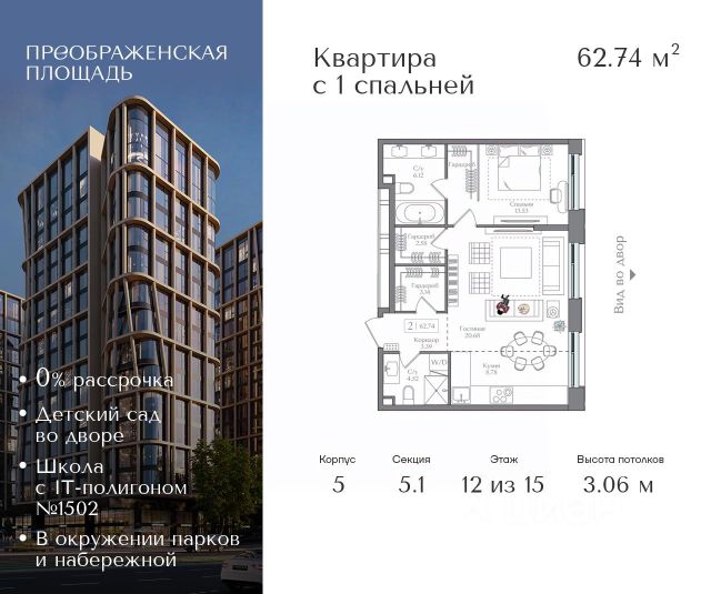 Квартира расположена в секции 2, окна выходят во внутренний двор.