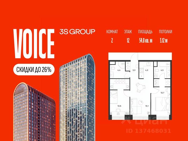 Ипотека от 3,5% на весь срок. Дополнительная скидка в офисе продаж! Продается уютная 2-комн. квартира площадью 54,3 кв.м на 12 этаже жилого комплекса бизнес-класса Voice Towers от 3S Group. Общая площадь: 54,3 кв.м., жилая: 38,2 кв.м., площадь кухни-гостиной: 18,7 кв.м., высокие потолки: 3,12 м., санузел совмещенный. О проекте: Voice. Высокие стандарты жизни Мы уверены, что высокие идеалы неизменно помогают достигать высот. Создавая Voice, мы ориентировались на людей с высокими требованиями к качеству и безупречным вкусом. Башни жилого комплекса, сочетают элегантную форму с динамичной геометрией фасадов, устремляются ввысь и отвечают самым высоким стандартам строительства. Технологичность, воплощенная в архитектуре - это ваш, собственный Voice. Преимущества локации Близость к метро Текстильщики, БКЛ и МЦК Новохохловская (10 мин) Рядом природный заповедник и конно-спортивная база Кузьминки-Люблино Будущее окружение Проект Южный порт - Текстильщики с деловым центром Сити-2 Небоскребы высотой до 300м Культурный центр с амфитеатром Променад вдоль Москвы-реки и яхт-клуб Архитектура Проект от Архитектурной мастерской Алексея Ильина Две перпендикулярные башни с арочными вершинами Высокая башня: светло-серый металл Низкая башня: терракотовая керамика Благоустройство Внешняя зона: парковки, магазины, кафе Внутренний двор: закрытая территория с озеленением Шумозащитный экран Сезонное озеленение Встречи на высоте Гранд-лобби высотой 8м Дизайнерская мебель Умные скоростные лифты Услуги Детский центр с игровой зоной Фитнес-студия для жителей