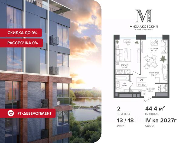 При приобретении квартиры доступна беспроцентная рассрочка с первым платежом от 30%. У покупателя также есть право воспользоваться скидкой в размере 7% от полной стоимости квартиры. Условия программы рассрочки: - Скидка 7% - Первый платеж — от 30% от стоимости объекта. - Оставшаяся сумма выплачивается не позднее 31.05.2026. - Действует на приобретение квартир в корп. 4, 5 Продаётся 2-к квартира 37,8 кв.м. в ЖК "Михалковский" на 13-м этаже 15 этажного дома. Скидка 9% при покупке квартиры! Цена указана с учетом максимального размера скидки. Ипотека для каждого! Полная стоимость кредита от 12,380% до 18,537%. Ставка от 0,11% в АО "Альфа-Банк", ген. лицензия ЦБ РФ 1326 от 16.01.2015. Ставка фиксируется на первые 12 месяцев, далее полная стоимость кредита от 22,022% до 24,599% ставка 21,59%. Первоначальный взнос — от 20,1% от стоимости квартиры. Срок кредитования — от 4 до 30 лет. Компания "РГ-Девелопмент" предоставляет скидку на квартиры в жилом комплексе. Акция действительна до 30.04.2026 включительно. Чтобы воспользоваться предложением, необходимо подписать договор на приобретение недвижимости до 30.04.2026 включительно. Действует программа "Растет семья - растет и квартира". Компания "РГ-Девелопмент" вошла в ТОП-10 девелоперов по объёму введённого жилья в "Старой Москве" по итогам 2025 года. Прямая продажа от застройщика! Квартиры без отделки. Срок сдачи 1 кв. 2026 г., корпус сдан Особенности проекта: Завораживающие виды Красивое благоустройство Уникальная локация для Москвы (рядом Головинский парк, пруды, усадьба Михалково) Рядом с центром В проекте присутствует: архитектура голландского бюро MLA+, зеленые зоны, транспортная доступность, благоустроенная территория, подземный паркинг, детский сад и выход на Головинский парк с пятью прудами. Название комплекса указывает на одну из его черт - соседство с имением Михалково. Позвольте себе жить в месте, где проводили свой досуг династии Дашковых и Паниных.