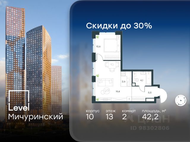 В жилом квартале, расположенном на границе с природным заказником "Долина реки Очаковки", продаётся 2-комнатная квартира площадью 42.20 кв.м с отделкой white box. Квартира расположена на 13 этаже 42-этажного корпуса 10 в жилом комплексе бизнес-класса Level Мичуринский (компания Level Group/Левел групп).
