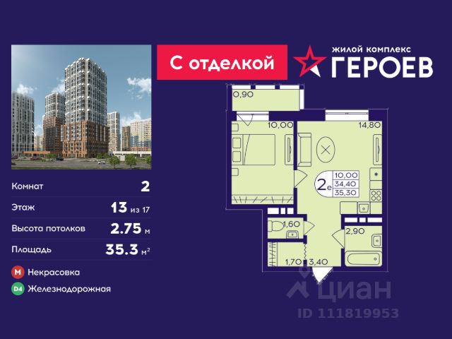 Продаётся 2-комнатная квартира 33.6 кв. м. в жилом комплексе "Героев" в Балашихе, Железнодорожный. Квартира расположена на 13 этаже 407 корпуса. Все квартиры представлены с чистовой отделкой. Вам не нужно тратить время и дополнительные финансы на ремонт или жить в шуме строительных работ - достаточно перевести свои вещи, расставить мебель и всё готово! Жилой квартал "Героев" - это уютный проект для семей с детьми. Всего 40 минут до центра Москвы. В квартале созданы все условия для досуга всех возрастов: игровые и спортивные площадки, места для отдыха и прогулок, магазины, кафе и пункты выдачи. За 15 минут можно дойти от дома до Ольгинского лесопарка - популярного места для прогулок и отдыха на свежем воздухе. Здесь приятно гулять всей семьёй, заниматься спортом или устроить пикник в выходной день. Преимущества: Квартира с готовой отделкой. Пространство полностью подготовлено для жизни: не нужно тратить время и деньги на ремонт или ждать его окончания. После получения ключей достаточно расставить мебель - и можно сразу заезжать и жить. Продуманные и светлые планировки. Просторные кухни-гостиные создают комфортное пространство для отдыха и встреч с близкими. В квартирах предусмотрены удобные гардеробные, благодаря чему легко поддерживать порядок и не перегружать комнаты шкафами. Увеличенное остекление. Большие окна наполняют квартиру естественным светом в течение всего дня, создавая ощущение простора и уюта, а также визуально расширяя пространство и делая интерьер более воздушным. Пешая доступность до станции Железнодорожная (МЦД-4) - дорога займёт не более 30 минут до центра Москвы: станции метро "Курская", "Площадь Ильича" или ТПУ Нижегородская.