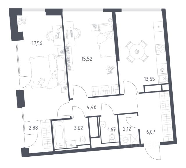 Строим кварталы для жизни с заботой о будущем. Предлагается 2-комнатная квартира комфорт-класса площадью 60,85 кв.м в корпусе 2 на 13-м этаже, в жилом комплексе "Квартал Домашний". Застройщик сдает квартиры с отделкой в нескольких вариантах: предчистовая, готовая или вариант без нее. Последний подойдет тем, кто хочет создать свой уникальный интерьер и ничем себя не ограничивать. А если не хочется тратить время на ремонт, можно выбрать опцию — с отделкой. Перед тем как отдать ключи, застройщик установит натяжные потолки, поклеит обои под покраску, положит ламинат светлых тонов, а в санузлах — керамическую плитку и керамогранит. Приобрести квартиру возможно по специальным акциям от застройщика, с текущими условиями акций можно ознакомиться в блоке "Акций". Цена динамическая и может отличаться, уточняйте актуальность у застройщика. "Квартал Домашний" находится в Марьино — всего 7 минут пешком до МЦД-2 "Курьяново". Рядом с домом — набережная Москвы-реки. Внутренняя инфраструктура проекта продумана до мелочей: от супермаркетов до кафе и салонов красоты. В "Квартале Домашнем" можно выбирать свою высоту — в комплексе есть корпуса от 7 до 19 этажей. Среди планировочных решений — просторные кухни-гостиные, гардеробные, постирочные, лоджии и угловые окна. "Квартал Домашний" — это: 1. До станции МЦД-2 "Курьяново" — 7 минут пешком 2. До станции метро "Марьино" — 7 минут на машине 3. До парка 850-летия Москвы — 5 минут пешком 4. До парка "Борисовские пруды" — 15 минут на машине 5. До музея-заповедника "Царицыно" — 20 минут на авто 6. Музей-заповедник "Коломенское" — для фотосессий и прогулок 7. Европейская архитектура с фасадами природных оттенков: песочного, серого, зеленого, терракотового 8. Школа со стадионом, 2 детских сада — на территории квартала 9. Магазины, кафе и салоны красоты на первых этажах домов 10. Приватные дворы без машин 11. Подземный паркинг с местами для электрокаров и индивидуальные кладовые 12. Спортивные и игровые площадки 13. В планах построить школу со стадионом и 2 детских сада