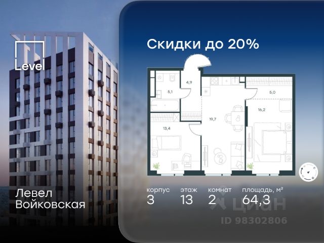 Цена указана с учётом скидки при 100%-й оплате, несубсидированной ипотеке, рассрочке (кроме программы "Рассрочка 0%"). Продается 2-комнатная квартира площадью 72.30 кв. м без отделки. Квартира находится на 13 этаже 20-этажного корпуса 5, в новом жилом комплексе бизнес-класса Левел Войковская, расположенном рядом с живописным заповедником "Покровское-Стрешнево" (застройщик - компания Level Group/Левел групп). Прекрасная транспортная доступность - 7 мин. пешком до станции МЦК "Балтийская"; - 15 мин. пешком до станции метро "Войковская"; - 8 мин. на машине до ТТК; - 15 мин. на машине до центра Москвы; - 20 мин. на машине до Москва-Сити. Продуманный архитектурный проект - стильная архитектура от мастерской Фефелова В. В.; - панорамные виды на парки, Химкинское водохранилище и Останкинскую башню; - лобби с высотой потолков до 6,45 метров; - более 20 видов планировок, включая редкие форматы квартир с террасой и увеличенной высотой потолков до 5,42 метров; - 2 варианта дизайнерской отделки в корпусе 4 как дополнительная опция к отделке white box: стиль Modern в светлых холодных тонах и стиль Classic в нейтральной бежевой гамме. Квартиры в корпусах 3 и 5 сдаются без отделки. Расположение Жилой комплекс Левел Войковская строится в престижном Северном округе Москвы, где развитая инфраструктура и живописная природа переплетаются в единый ансамбль. Войковский район окружают парки и набережные. В шаговой доступности - парк "Покровское-Стрешнево", не более 15-ти минут на велосипеде занимает путь до Тимирязевского парка и 9-ти минут до парка усадьбы Михалково. Рядом более 60 школ, 75 дошкольных учреждений, 17 государственных и 6 частных вузов, 25 супермаркетов, 4 торговых центра, среди которых ТЦ "Метрополис" и ТЦ "Авиапарк". Внутренняя инфраструктура На территории жилого комплекса предусмотрены коммерческие помещения: кафе, ресторан, пекарня и другие сервисы на первых этажах корпусов. Для жителей будет доступен отапливаемый подземный паркинг на 244 машино-места с доступом с любого этажа на лифте. На территории паркинга будет расположено 125 кладовых помещений для хранения сезонного инвентаря. Лобби и благоустройство Дизайн лобби жилого комплекса Левел Войковская создан совместно с бюро BLANK. Теплая цветовая гамма, ресепшен, зоны ожидания, лапомойки и гостевые санузлы - каждая деталь превращает лобби в комфортное продолжение вашего дома. 1,15 га площади в первых двух этапах строительства отведено под приватный внутренний двор, который спроектирован совместно с бюро "Правда". Детские площадки для всех возрастов, спортивные пространства для йоги, воркаута и петанка, уютные зоны для тихого отдыха или работы. Здесь утро начинается с вдохновения, а вечер наполнен приятными моментами. Лифты Комфортное перемещение внутри жилого комплекса обеспечат надёжные лифты с доступом в паркинг с жилых этажей. В каждом корпусе предусмотрено по 3 грузопассажирских лифта.