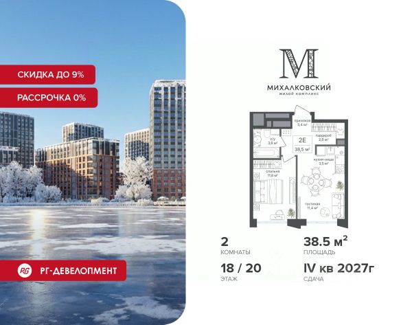 Новогодняя скидка 9% при покупке квартиры! Продаётся 2-к квартира 41,5 кв.м. в ЖК "Михалковский" на 13-м этаже 20 этажного дома. Компания "РГ-Девелопмент" предоставляет новогоднюю скидку на квартиры в жилом комплексе. Акция действительна с 12.09.2024 по 31.12.2025 включительно. Для того чтобы воспользоваться предложением, необходимо подписать договор на приобретение недвижимости до 31.12.2025 включительно. Рассрочка 0% + Скидка 5%. При приобретении дольщиком квартиры в любом из двух данных корпусов с использованием способа оплаты "Рассрочка 0%", у покупателя также есть право воспользоваться скидкой в размере 5% от полной стоимости квартиры. Условия программы рассрочки: Первый платеж составляет 20% от стоимости объекта и вносится при заключении ДДУ. Второй платеж в размере 20% от стоимости объекта вносится по истечении 12 месяцев со дня подписания ДДУ. Оставшаяся сумма, в размере 60%, выплачивается за месяц до планового срока ввода ЖК в эксплуатацию, то есть не позднее 31.05.2027. Действует на приобретение квартир в корп. 2, 7. Действует программа "Растет семья - растет и квартира". Прямая продажа от застройщика! Старт продаж новых корпусов. Квартиры без отделки. Срок сдачи IV кв. 2027г. Особенности проекта: Завораживающие виды Красивое благоустройство Уникальная локация для Москвы (рядом Головинский парк, пруды, усадьба Михалково) Рядом с центром В проекте присутствует: архитектура голландского бюро MLA+, зеленые зоны, транспортная доступность, благоустроенная территория, подземный паркинг, детский сад и выход на Головинский парк с пятью прудами. Название комплекса указывает на одну из его черт - соседство с имением Михалково. Позвольте себе жить в месте, где проводили свой досуг династии Дашковых и Паниных.