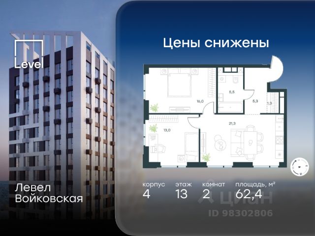 Цена указана с учётом скидки при 100%-й оплате, несубсидированной ипотеке, рассрочке (кроме программы "Рассрочка 0%"). Продается 2-комнатная квартира площадью 70.40 кв. м без отделки. Квартира находится на 13 этаже 20-этажного корпуса 3, в новом жилом комплексе бизнес-класса Левел Войковская, расположенном рядом с живописным заповедником "Покровское-Стрешнево" (застройщик - компания Level Group/Левел групп). Прекрасная транспортная доступность - 7 мин. пешком до станции МЦК "Балтийская"; - 15 мин. пешком до станции метро "Войковская"; - 8 мин. на машине до ТТК; - 15 мин. на машине до центра Москвы; - 20 мин. на машине до Москва-Сити. Продуманный архитектурный проект - стильная архитектура от мастерской Фефелова В. В.; - панорамные виды на парки, Химкинское водохранилище и Останкинскую башню; - лобби с высотой потолков до 6,45 метров; - более 20 видов планировок, включая редкие форматы квартир с террасой и увеличенной высотой потолков до 5,42 метров; - 2 варианта дизайнерской отделки в корпусе 4 как дополнительная опция к предчистовой отделке: стиль Модерн в светлых холодных тонах и стиль Классик в нейтральной бежевой гамме. Квартиры в корпусах 3 и 5 сдаются без отделки. Расположение Жилой комплекс Левел Войковская строится в престижном Северном округе Москвы, где развитая инфраструктура и живописная природа переплетаются в единый ансамбль. Войковский район окружают парки и набережные. В шаговой доступности - парк "Покровское-Стрешнево", не более 15-ти минут на велосипеде занимает путь до Тимирязевского парка и 9-ти минут до парка усадьбы Михалково. Рядом более 60 школ, 75 дошкольных учреждений, 17 государственных и 6 частных вузов, 25 супермаркетов, 4 торговых центра, среди которых ТЦ "Метрополис" и ТЦ "Авиапарк". Внутренняя инфраструктура На территории жилого комплекса предусмотрены коммерческие помещения: кафе, ресторан, пекарня и другие сервисы на первых этажах корпусов. Для жителей будет доступен отапливаемый подземный паркинг на 244 машино-места с доступом с любого этажа на лифте. На территории паркинга будет расположено 125 кладовых помещений для хранения сезонного инвентаря. Лобби и благоустройство Дизайн лобби жилого комплекса Левел Войковская создан совместно с бюро "Бланк Архитектс" (Blank Architects). Теплая цветовая гамма, ресепшен, зоны ожидания, лапомойки и гостевые санузлы - каждая деталь превращает лобби в комфортное продолжение вашего дома. 1,15 га площади в первых двух этапах строительства отведено под приватный внутренний двор, который спроектирован совместно с бюро "Правда". Детские площадки для всех возрастов, спортивные пространства для йоги, уличных тренировок и петанка, уютные зоны для тихого отдыха или работы. Здесь утро начинается с вдохновения, а вечер наполнен приятными моментами. Лифты Комфортное перемещение внутри жилого комплекса обеспечат надёжные лифты с доступом в паркинг с жилых этажей. В каждом корпусе предусмотрено по 3 грузопассажирских лифта.