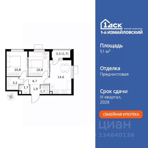 Прямая продажа от застройщика! Жилой Комплекс Комфорт класса. Продаётся 2-к квартира номер 1013 общей площадью 51.1 кв.м. на 14-м этаже 25 этажного здания. Предчистовая отделка. Цена с учётом скидки. Особенности квартиры: - Организуем показ в удобное для вас время! - Просторная спальня, в которой можно разместить большую кровать. - Угловая планировка - больше пространства для ваших идей. - Увеличенное количество окон - дополнительное освещение и свежий воздух. - Раздельный санузел - больше удобства для всех членов семьи. - Место для игры/занятия спортом - идеальное пространство для активных детей. - Можно оборудовать рабочее место - комфорт для работы и учёбы. - Просторная кухня - место для семейных ужинов и кулинарных экспериментов. - Гардеробная - удобство для хранения и организации вещей. - Лоджия - уютное место для отдыха и тишины. - Панорамное остекление лоджии - открывает вид на окружающий мир. Квартира с предчистовой отделкой. Вам не придется заниматься черновыми и трудоёмкими работы, а чистовую отделку и дизайн - сделайте на свой вкус. Информация о комплексе: ЖК "1-й Измайловский" в восточной части Москвы: идеальное место для жизни в окружении 14 000 гектаров леса. Наслаждайтесь лыжными прогулками зимой и пробежками летом в сиреневом саду и лесопарках. Комплекс отгорожен от шоссе застройкой первой линии и садами здоровья. Из окон открываются виды на парк "Лосиный остров" и зеленые дворы. Близость к природе и спортивным объектам создаёт атмосферу здорового образа жизни. Транспортная доступность: Не более 2,5 км до станций метро "Щёлковская" и "Черкизовская" и МЦК "Локомотив". Щёлковское шоссе соединяет квартал с Северо-восточной хордой и МКАД, Центральным автовокзалом и Восточным железнодорожным вокзалом. Две автобусные остановки в паре минут ходьбы и 11 маршрутов общественного транспорта. На автомобиле 3 минуты до СВХ 12 минут до ТТК 15 минут до Садового кольца Внутренняя инфраструктура: ЖК расположен в историческом районе Москвы с развитой инфраструктурой. В шаговой доступности: 6 детских садов (включая собственный на 125 мест), 3 школы, поликлиники, торговые центры и парки. Проект создан для здорового образа жизни: рядом стадионы, спортивные объекты для футбола, баскетбола и конного спорта, а также более 30 км беговых и велодорожек. Всё для активной жизни в окружении зелени и современной инфраструктуры. Квартира с предчистовой отделкой - ваш дизайн без черновых работ