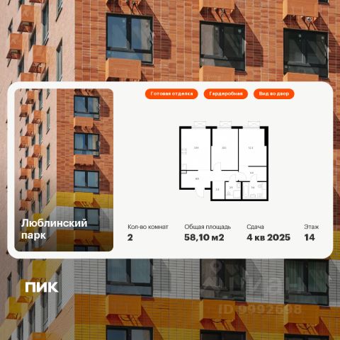 Продаётся 2-комн. квартира площадью 56,2 кв.м на 14 этаже 25 этажного дома (Корпус 19, Секция 1) проекта ПИК Люблинский парк. Светлый просторный подъезд на уровне земли, функциональная планировка, большие окна, c отделкой. Жилой квартал "Люблинский парк" расположен на юго-востоке Москвы, в шаговой доступности от станции "Братиславская". На метро до центра ехать всего 30 минут. Также недалеко станция МЦД "Перерва", от которой можно уехать в Москву или в область. В проекте 54 жилых корпуса, три школы, семь детских садов, поликлиника. В районе есть все условия для комфортной жизни: торговые центры, школы, детские сады, поликлиники и спортивные центры. Рядом находятся усадьба Люблино, скверы и парки. Различные магазины, кафе и другие сервисы откроются на первых этажах, а на подземных будут паркинги с удобной навигацией. В зелёных дворах без автомобилей мы построим детские площадки и места для отдыха. А ещё "Люблинский парк" стал третьим проектом ПИК с большой игровой площадкой PlayHub, которая уже открылась между 1-м и 2-м блоками на безопасном расстоянии от дороги. Новое детское пространство "Остров" воплощает идею бесконечной игры. Ландшафт площадки — это ещё и игровой элемент, который помогает детям придумывать множество самых разнообразных игр. Здесь интересно детям разного возраста — от малышей до подростков. Жителям квартала Люблинский парк и их друзьям доступен проект ПИКСПОРТ — это бесплатные занятия с профессиональными тренерами. Тренировки по разным направлениям, например йога, фитнес, бег, воркаут, проходят как в группе на улице рядом с домом, так и онлайн. Артикул 605188 (Застройщик ООО СЗ "Люблино Девелопмент")