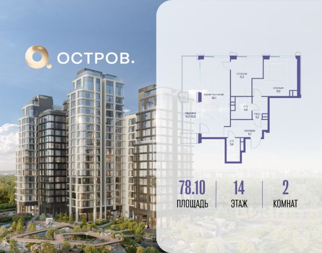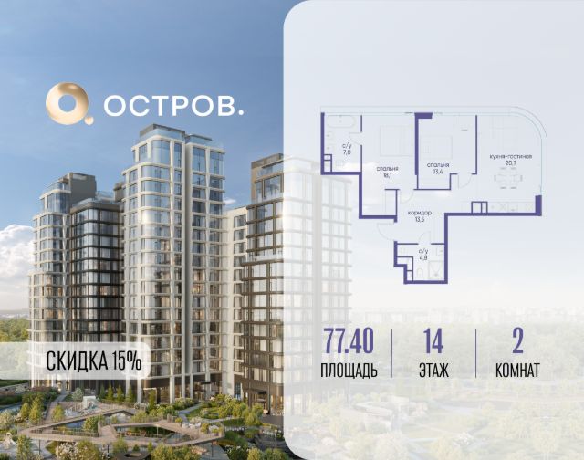 Скидка до 15% действует до 25.12.2025 г. при 100% оплате и не субсидированной ипотеке. Продаётся двухкомнатная квартира от застройщика: общая площадь 79.10 м², жилая 25.20 м², кухня 30.40 м², 14, жилой квартал "Остров 7", корпус 3 (7 квартал) (секция 1). срок сдачи: 4-кв. 2025. , 2 санузла: 2 совмещенных. В жилой зоне 2 больших окна на одну сторону, хорошая инсоляция. Позвоните сейчас и забронируйте квартиру! Купите квартиру в доме у прибрежного парка, в квартале ОСТРОВ.7. Это семь корпусов премиум- и бизнес-класса в одном из лучших мест ОСТРОВА - между бульваром и парком, поблизости от реки. Стильные корпуса имеют узнаваемый вид благодаря бионической пластике фасадов, приподнятых над землей. Для жителей предусмотрены детский клуб, фитнес-рум, коворкинг, переговорные, лаунжи. На крышах устроены видовые общественные пространства с зонами для отдыха и спорта. Двор расположен на двух уровнях: нижний ландшафтный парк и верхняя городская терраса. ОСТРОВ.7 - часть жилого комплекса на западе Москвы, в 15 минутах езды от центра. Это настоящий заповедник посреди большого города, в окружении реки и 650 га заповедников. Здесь все необходимое находится по соседству: от детского сада до супермаркета, от фитнес-зала до серфинг-центра. На территории созданы все условия для отдыха и общения: клубная инфраструктура в домах и дворы-парки, набережные и променады, маршруты для спортсменов, детей и возрастных жителей. В нескольких минутах ходьбы расположена станция метро "Терехово" БКЛ. На автомобиле - 10 минут до Москва-Сити и 15 минут до Садового кольца.
