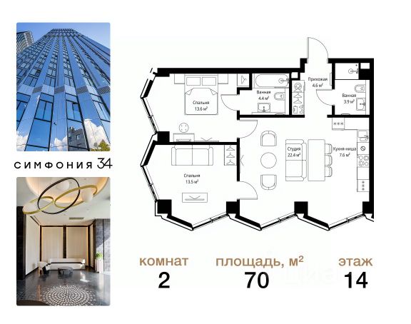 Дом сдан. Ключи в день покупки! В продаже 2-комнатная квартира площадью 70 м² с предчистовой отделкой на 14 этаже 49 этажного дома в корпусе Кристал. ЖК Симфония 34 - концептуально новый жилой комплекс премиум-класса с подземной парковкой, состоит из четырех башен высотой 36 - 54 этажа. Квартиры сдаются с базовой (предчистовой) отделкой MR BASE или дизайнерской чистовой отделкой MR READY. Высота потолков 3 - 6 метров, окна высотой до 2,6 м. Более 100 кладовых в подземной части ЖК и более 500 на этажах. Безопасность - Система контроля входа на территорию комплекса, биометрия - Система автоматического водяного пожаротушения и противопожарного водопровода, система пожарной вентиляции - Доступ на парковку при помощи системы распознавания автомобильных номеров, карточка для контроля доступа резидентов - Система видеонаблюдения - Круглосуточная связь через приложение, телефон, голосовые сообщения с охраной, консьержем, call-центр. Расположение Пешком - 6 минут до метро "Дмитровская" - 15 минут до Тимирязевского парка На машине - 5 минут до Савеловского вокзала и Аэроэкспресса в Шереметьево - 10 минут до Москва-Сити и Садового кольца Благоустройство - 70% территории отведены под зеленые насаждения и ландшафтный дизайн - Приватный Японский сад - Детские площадки с зонированием по возрасту - Clubhouse для резидентов - Wellness & SPA - Зона для пикника, зона с гамаками - Центральное лобби, ресторан, коммерческие помещения - Дополнительный вход/выход на территорию комплекса Окружение - В 10 минутах от Симфония 34 находится дизайн-завод Flacon, где регулярно проходят культурно-образовательные и развлекательные мероприятия - Тимирязевский парк расположен в 850 м. Площадь парка 232 га - Рядом расположен парк "Дубки", площадью 16,5 га. - В 15 минутах расположен Хлебозавод 9. Здесь находятся шоурумы брендов, кафе разных кухонь мира, образовательные проекты и площадки для мероприятий Компания MR предлагает своим клиентам специальные условия приобретения квартир в рамках программ ипотечного кредитования от банков-партнеров.