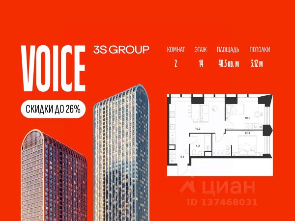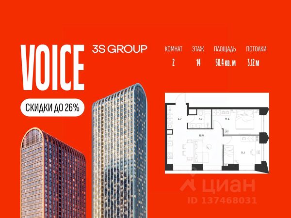 Ипотека от 3,5% на весь срок. Дополнительная скидка в офисе продаж! Продается уютная 2-комн. квартира площадью 54,3 кв.м на 14 этаже жилого комплекса бизнес-класса Voice Towers от 3S Group. Общая площадь: 54,3 кв.м., жилая: 38,2 кв.м., площадь кухни-гостиной: 18,7 кв.м., высокие потолки: 3,12 м., санузел совмещенный. О проекте: Voice. Высокие стандарты жизни Мы уверены, что высокие идеалы неизменно помогают достигать высот. Создавая Voice, мы ориентировались на людей с высокими требованиями к качеству и безупречным вкусом. Башни жилого комплекса, сочетают элегантную форму с динамичной геометрией фасадов, устремляются ввысь и отвечают самым высоким стандартам строительства. Технологичность, воплощенная в архитектуре - это ваш, собственный Voice. Преимущества локации Близость к метро Текстильщики, БКЛ и МЦК Новохохловская (10 мин) Рядом природный заповедник и конно-спортивная база Кузьминки-Люблино Будущее окружение Проект Южный порт - Текстильщики с деловым центром Сити-2 Небоскребы высотой до 300м Культурный центр с амфитеатром Променад вдоль Москвы-реки и яхт-клуб Архитектура Проект от Архитектурной мастерской Алексея Ильина Две перпендикулярные башни с арочными вершинами Высокая башня: светло-серый металл Низкая башня: терракотовая керамика Благоустройство Внешняя зона: парковки, магазины, кафе Внутренний двор: закрытая территория с озеленением Шумозащитный экран Сезонное озеленение Встречи на высоте Гранд-лобби высотой 8м Дизайнерская мебель Умные скоростные лифты Услуги Детский центр с игровой зоной Фитнес-студия для жителей