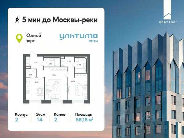 Продаётся 2-комнатная квартира от застройщика ГК "КОРТРОС" в жилом комплексе бизнес-класса УЛЬТИМА Сити. Квартира расположена на 14 этаже 52 этажного корпуса 2. Общая площадь 56,15 м². Без отделки. УЛЬТИМА Сити — жилой комплекс бизнес-класса в перспективном районе на юго-востоке Москвы. На его территории появятся 9 башен на 756 этажей, двухуровневый подземный паркинг, собственная инфраструктура, включая детский сад и школу. Всего девелопер благоустроит территорию в 2,6 га. Ближайшая станция метро — ""Южный порт"". Она откроется в 2028 году и будет находиться в 2-х минутах ходьбы. А прямо напротив расположится остановка водного автобуса-электрохода ""Синичка"". Дорога от квартала будет удобна и для автомобилистов: - до Кремля — 12 км - до МКАД — 12 км - до выезда на ТТК — 3 км - до Садового кольца — 8 км В двух корпусах первой очереди УЛЬТИМА Сити этажностью 45 и 52 реализуется 1 079 квартир с продуманными, рациональными планировочными решениями. В ассортиментной линейке представлены однокомнатные квартиры от 28,2 до 61 кв. м, двухкомнатные лоты от 44,3 до 95,4 кв. м, квартиры с тремя (71 — 115,57 кв. м) и четырьмя спальнями (106,6 — 114,97 кв. м). В экспозиции также есть квартиры с террасами, лоджиями, тремя и четырьмя санузлами, а также с функциональными нишами-кладовыми на кухнях. Запроектированы и эксклюзивные двухуровневые резиденции со вторым светом, в том числе с видом на Москву-реку, площадью от 77,7 до 141,9 кв. м. В рамках проекта запланировано строительство 9 корпусов, школы на 500 учащихся и детского сада на 225 мест. Еще будет создана продуманная инфраструктура для жителей: детские и спортивные площадки, амфитеатр для мероприятий, беседки и теплицы для садоводства, коворкинг, детский клуб и ресторан с открытой террасой. Доступ в жилой комплекс осуществляется по биометрическому контролю - Face ID. Вокруг квартала будет приватная территория с видеонаблюдением и консьерж-сервисом 24/7. Лобби корпусов будут иметь двойные выходы: на улицу и во внутренний закрытый двор.