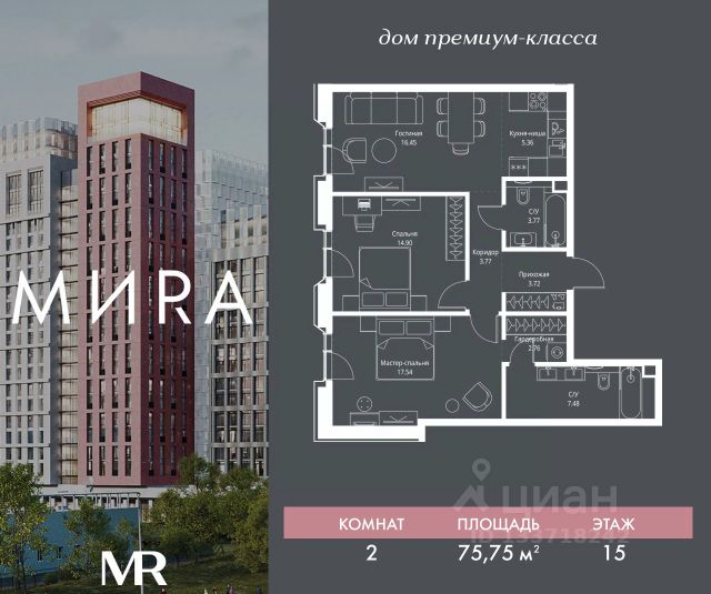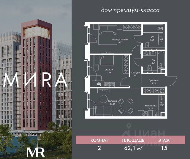 Прямая продажа от застройщика. Продаётся 2-комнатная квартира общей площадью 62.71 м² без отделки в доме премиум-класса МИRА на 15-м этаже 23 этажного дома. Квартира расположена в корпусе 2. Дом премиум-класса МИRA это: • Спокойный район с богатой историей и сложившейся инфраструктурой • Авторская архитектура на стыке классики и современности • Вход в парк прямо из жилого комплекса • Панорамные виды на Яузу, парки, ВДНХ и скульптуру "Рабочий и колхозница" • Удобные сервисы и безопасность для каждого резидента Расположение: Жилой квартал расположен в Алексеевском районе на северо-востоке Москвы, на второй линии домов, таким образом вы сможете дистанцироваться от шума и суеты проспекта Мира, но при этом будете жить недалеко от этой важной городской магистрали. Прямо у дома: • Парк Акведук • Река Яуза • Памятник "Рабочий и колхозница" Пешком: • 16 мин м. ВДНХ На автомобиле: • 12 мин ТТК • 15 мин Садовое кольцо • 12 мин Национальный парк "Лосиный остров" Благоустройство: Концепция благоустройства от бюро "ДРУЖБА" разработана в стиле "Лесная тропа". В уютном дворе расположились словно затерянные в лесу, площадки для отдыха. Они разделяются островками с травами, кустарниками, крупными камнями и деревьями, между которыми проходят узкие песчаные тропинки с деликатной подсветкой по вечерам. Центральной точкой притяжения для жителей станет главная площадь с фонтаном, которая открывается сразу из двух входных групп. Внутренний двор МИRA: • Детская площадка с зонами для игр малышей до трех лет и детей более старшего возраста • Спортивная площадка с профессиональным оборудованием для тренировок • Декоративные перголы • Воздушный арт-объект с подсветкой, похожий на облако • Чайный домик, где в отдельном отапливаемом павильоне можно в любое время года попить кофе с соседями или устроить камерное семейное чаепитие • Зоны для работы и отдыха с гамаком под навесом, скамейками и креслами Инфраструктура и окружение: В Алексеевском районе есть огромные благоустроенные парки, магазины, гимназии с высоким рейтингом и филиалы ВУЗов, частные и государственные детские сады, модные кофейни и фитнес-центры. В квартале МИRА предусмотрены: • 2 ресторана с видом на парк Акведук • 3 кафе • фитнес-студия • подземный паркинг на 330 машино-мест Компания MR предлагает своим клиентам специальные условия приобретения квартир в рамках программ ипотечного кредитования от банков-партнеров.