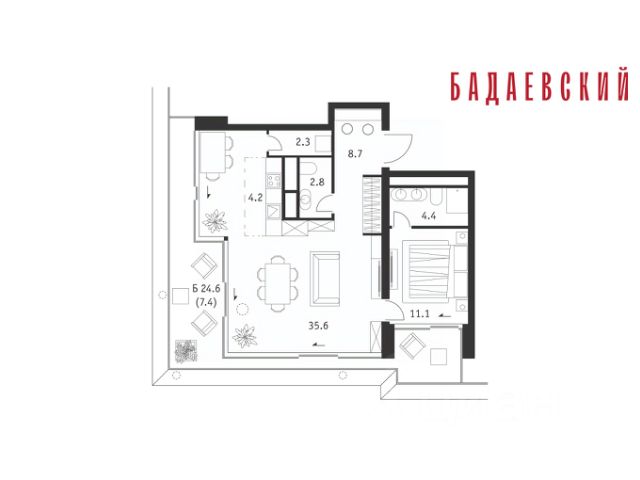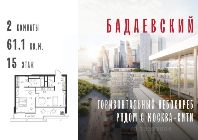 Продаётся 2-комнатная квартира общей площадью 76.50 м² на 15 этаже Жилого Комплекса Бадаевский. О нем говорили. Его ждали. Жилой комплекс "Бадаевский" на Кутузовском проспекте — это место для жизни, которое займет место в истории. Комплекс стал первым в истории московским проектом, победившим в категории Residential на World Architecture Festival. Девелопер Capital Group. В "Бадаевском" исторические здания завода и футуристические "парящие" дома создают единый комплекс, который станет новой достопримечательностью и символом Москвы. Панорамное остекление, террасы и веранды дарят неординарные и захватывающие виды. Благодаря расположению домов и панорамному остеклению, жилые пространства в "Бадаевском" будут наполнены светом. А виды из окон домов-"лент" на Москву-реку, пивоваренный завод, небоскребы "Москва-Сити" и Белый дом дополнены принципиально новым ощущением высоты. На территории Бадаевского завода появится масштабный ландшафтный парк с концепцией "русский лес". Впервые в истории района Дорогомилово у жителей появится прямая связь набережной Тараса Шевченко с Кутузовским проспектом. Близость Москвы-реки добавляет к преимуществам "Бадаевского" природную энергетику и приятные прогулки на свежем воздухе. Подземная парковка позволит сделать территорию завода полностью пешеходной, а сам комплекс представит новый подход к организации открытого и уединенного пространства в центре Москвы. Расположение в начале Кутузовского проспекта делает проект не только престижным, но и удобным: до Третьего транспортного и Садового кольца можно доехать за 5 минут, а Кремль и основные исторические достопримечательности расположены в 15 минутах на автомобиле. Напротив "Бадаевского" находится офисный кластер "Москва-Сити". Для жителей комплекс будет создано не только новое масштабное благоустройство, но и вся необходимая инфраструктура. В исторических корпусах появятся магазины, бутики, кафе и рестораны, коворкинг и крафтовая пивоварня, а в зданиях элеваторов — русская баня. Кроме того, запланирован фермерский рынок и досуговый кластер с музыкальной студией, центром детского творчества и фитнес-центром с бассейном.
