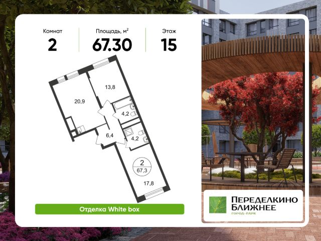 Продается двухкомнатная квартира в городе-парке "Переделкино Ближнее". Общая площадь квартиры - 44,5 кв. м, этаж 15 из 17. Срок сдачи - 3 квартал 2028 года. Тип дома - монолитный. Корпус расположен в новой 13 фазе строительства и состоит из 6 секций с переменной этажностью 12-17 этажей. Все секции с отделкой White Box с возможностью повышения за дополнительную плату до дизайнерской отделки: Classic или Smart+ Около 13 фазы запланировано строительство многоуровневого паркинга на 300 м/мест. 13 фаза имеет уникальное расположение и находится непосредственно на берегу Федосьинского пруда, который является сердцем города-парка "Переделкино Ближнее". Город-парк "Переделкино Ближнее" расположен в 8 км от МКАД по Боровскому шоссе. ТРАНСПОРТНАЯ ДОСТУПНОСТЬ: - 15 минут пешком до станции МЦД-4 "Мичуринец" - 25 минут пешком до станции метро "Рассказовка" Солнцевской линии - 30 минут до центра Москвы - 2026 г. - открытие трассы Солнцево-Бутово-Варшавское шоссе РАЗВИТАЯ СОЦИАЛЬНАЯ ИНФРАСТРУКТУРА: - 7 детских садов, 3 школы - банки, продуктовые магазины, аптеки, фитнес центры, салоны красоты и пр БЛАГОУСТРОЙСТВО: - дворы без машин - игровые зоны и развивающие детские площадки - зоны для созерцательного и медитативного отдыха - зоны для занятий спортом ОСОБЕННОСТИ АРХИТЕКТУРЫ: - высокие потолки от 3,03 м - безбарьерные входные группы - колясочные в каждой входной группе - кладовые помещения расположены на -1 этаже каждой секции - в каждой секции 2 лифта: 1 пассажирский, 1 грузовой - на фасаде предусмотрены корзины для установки кондиционеров АВТОРСКИЙ ДИЗАЙН: Входные группы выполнены по авторскому дизайну, благодаря панорамному остеклению наполнены естественным светом. В каждой входной группе будет располагаться комфортабельная зона ожидания с возможностью зарядить электронные устройства, почтовые ящики, колясочная, акцентные пуфы и столик.